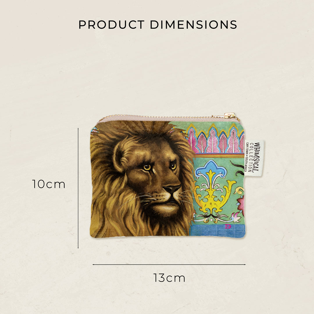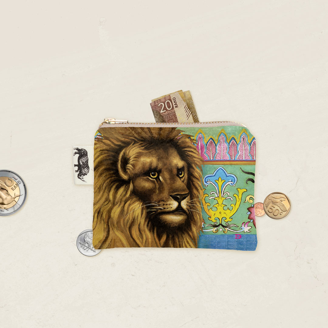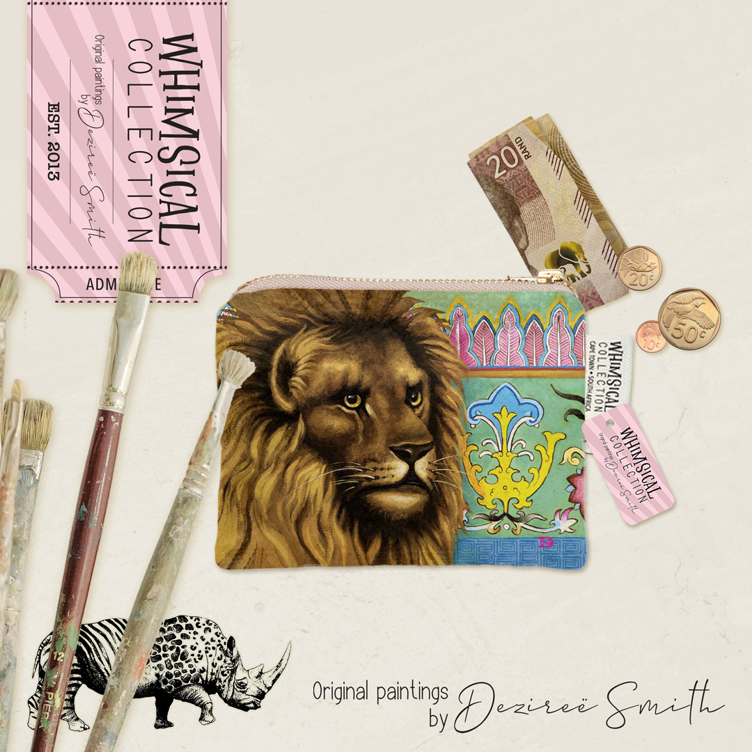 Velvet coin purse featuring 'Lion Ornament' from Whimsical Collection's 'African Ornaments' range. The original painting was done in oils on canvas by South African artist Dezireë Smith.