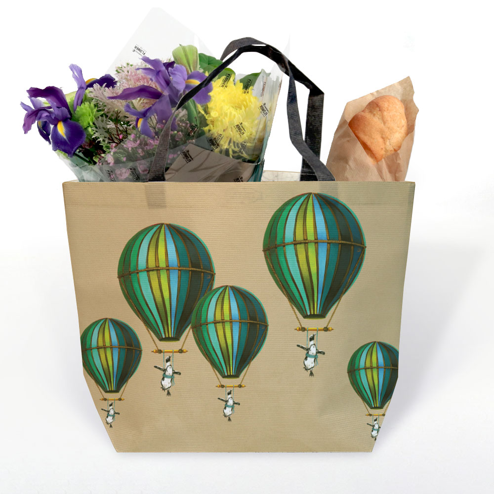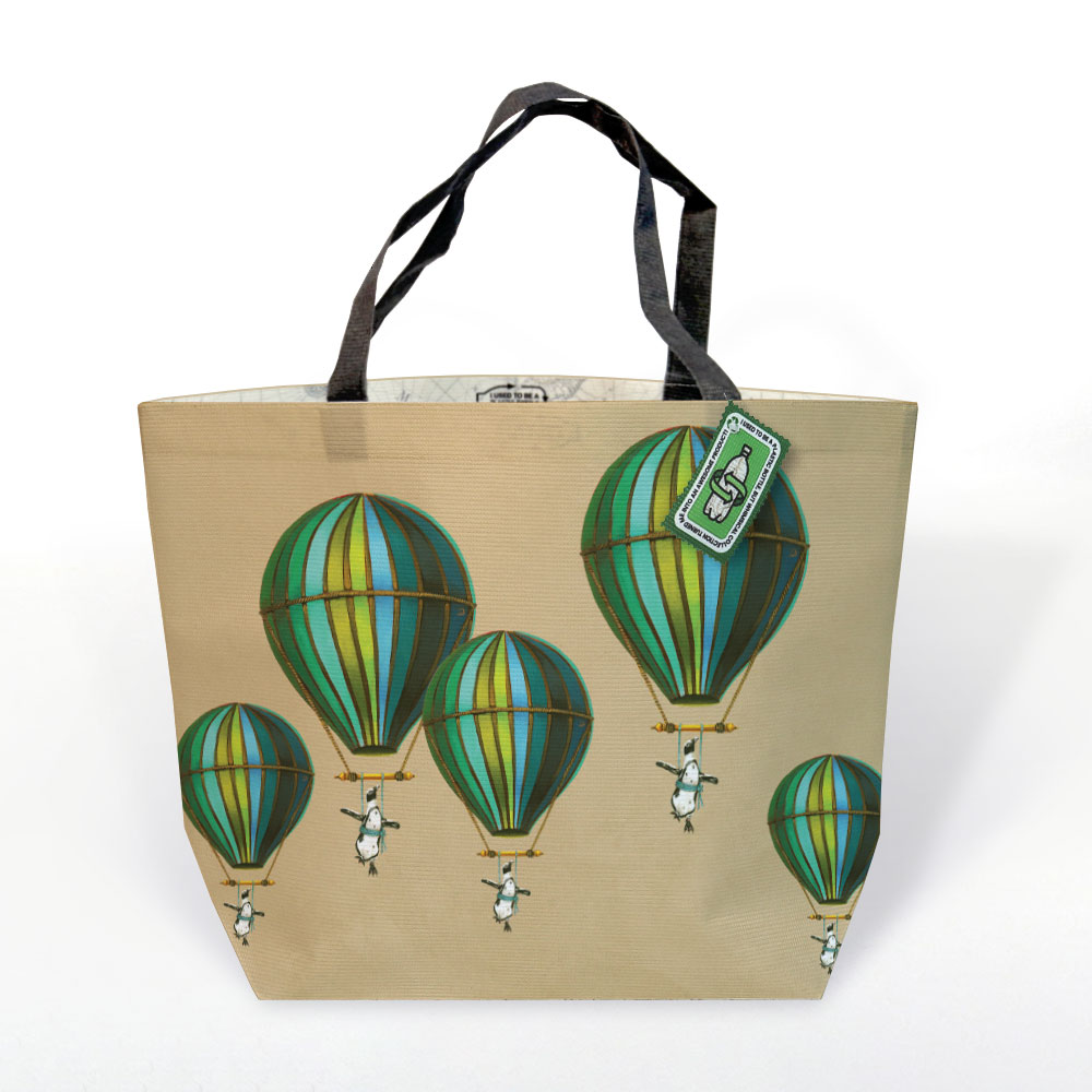20L Shopping bag made from recycled fabric featuring 'Muted Blue Penguin in Flight' from Whimsical Collection's 'Wildlife in Flight' range.  The original artwork was painted on paper by South African artist Dezireë Smith.