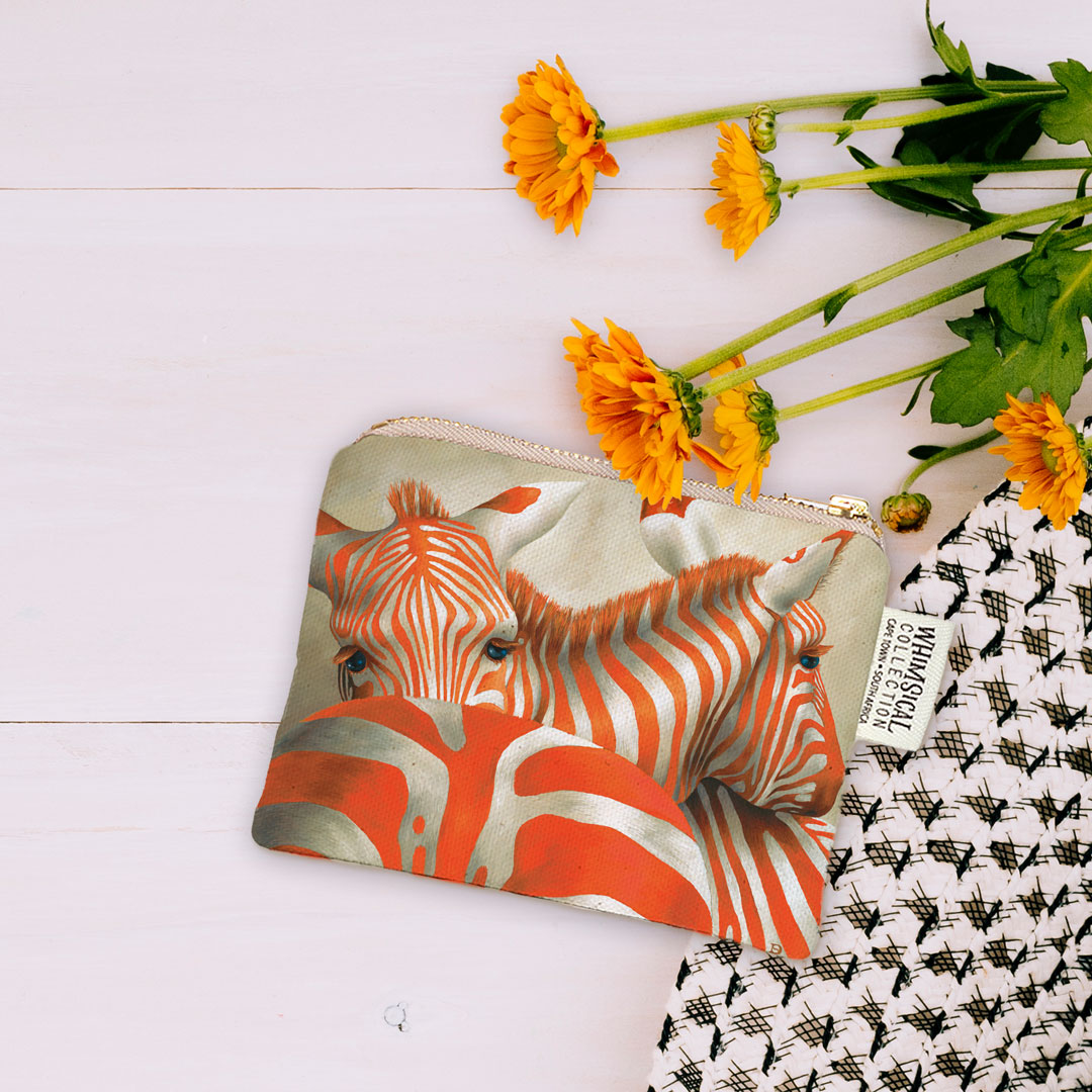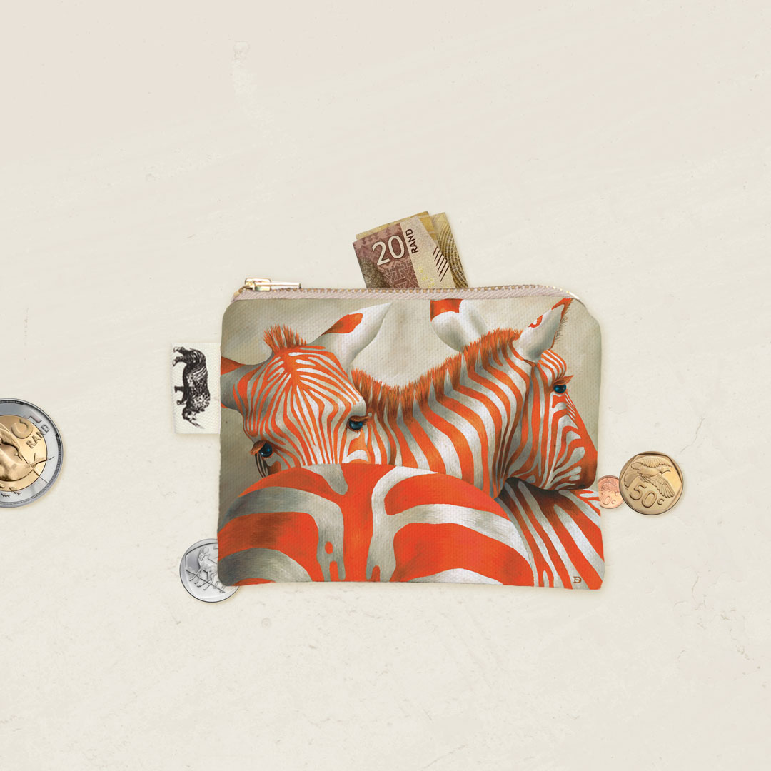 100% Cotton coin purse featuring 'Orange Zebra' from Whimsical Collection's 'African Kaleidoscope' range. The original painting was done in oils on canvas by South African artist Dezireë Smith.