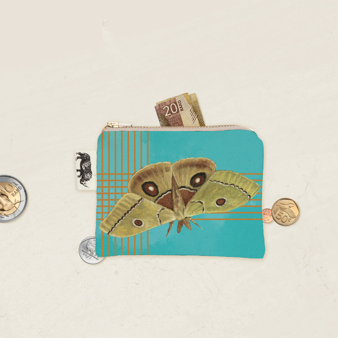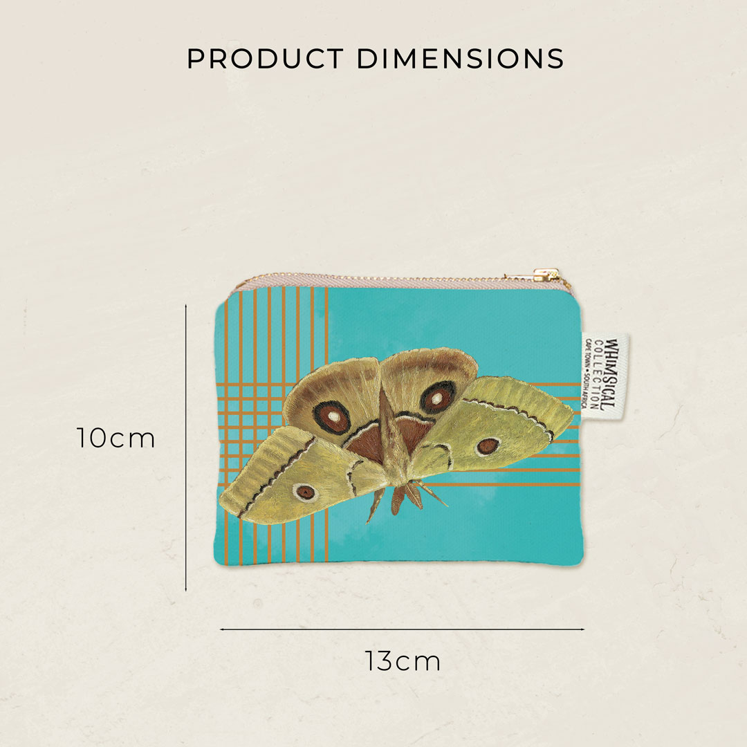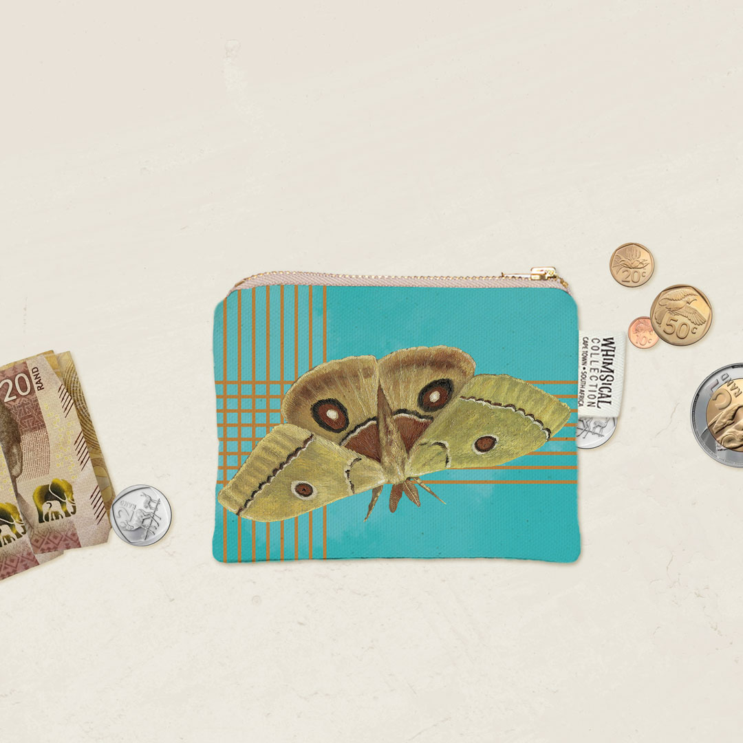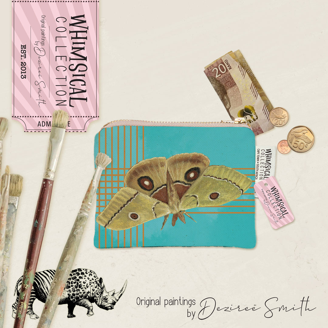 100% Cotton coin purse featuring a 'Pine Emperor Moth' from Whimsical Collection's 'Moths & Butterflies' collection in the 'African Insects' range. The original painting was done in oils by South African artist Dezireë Smith.