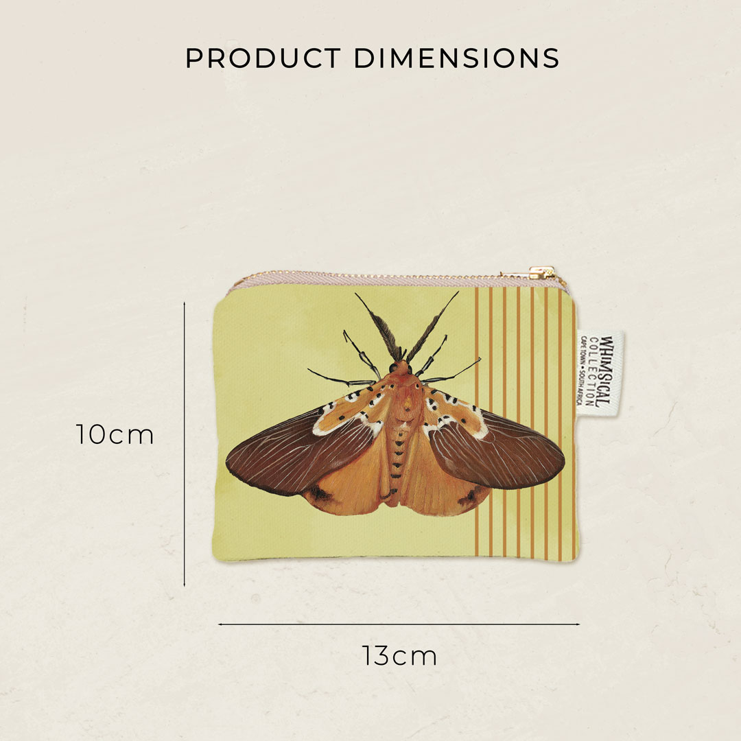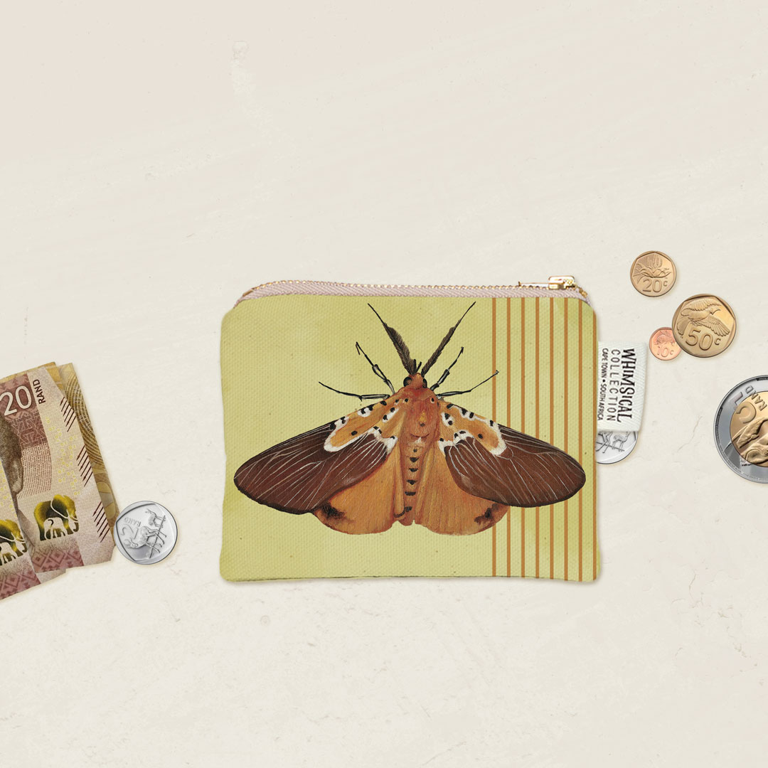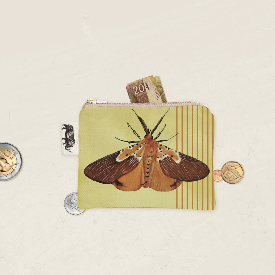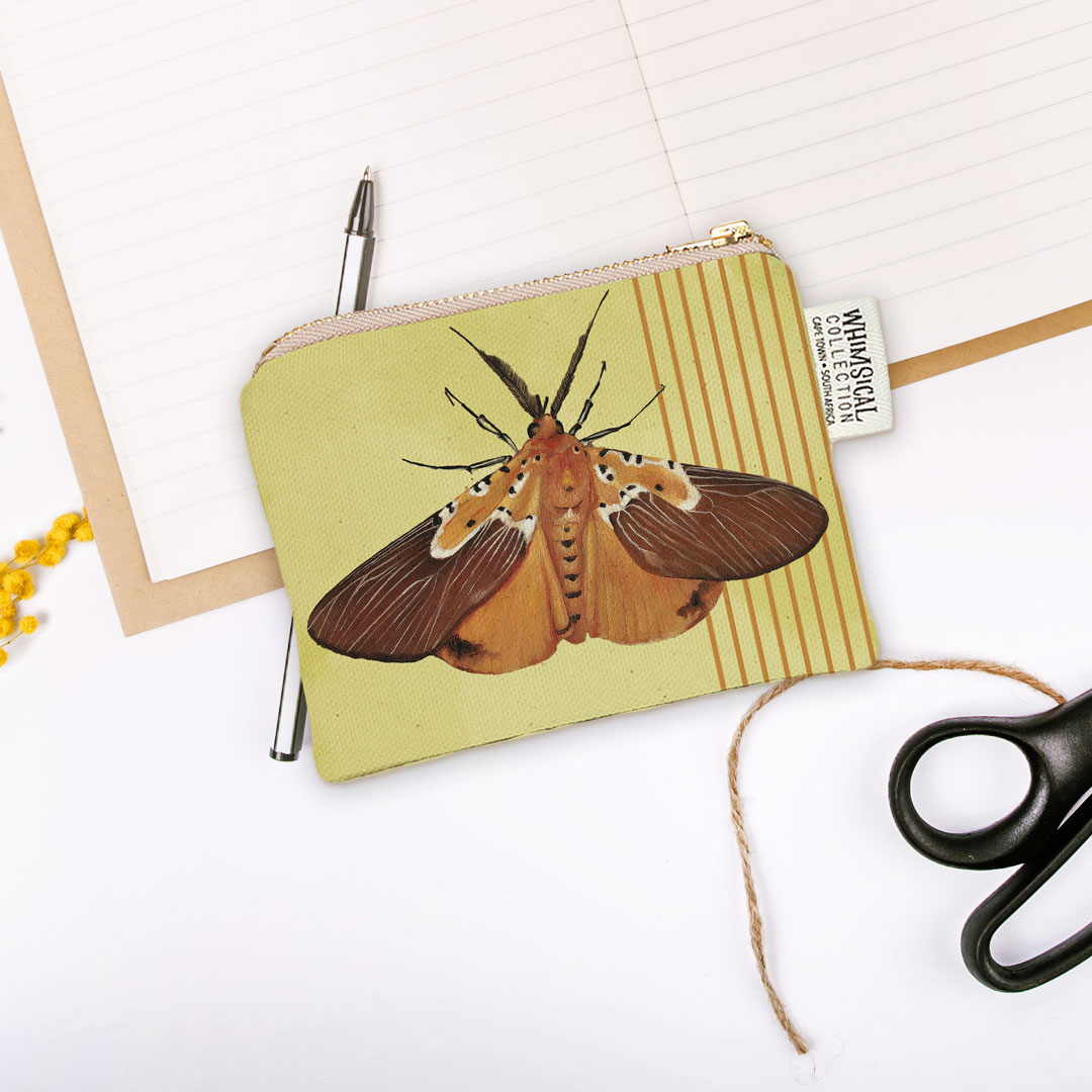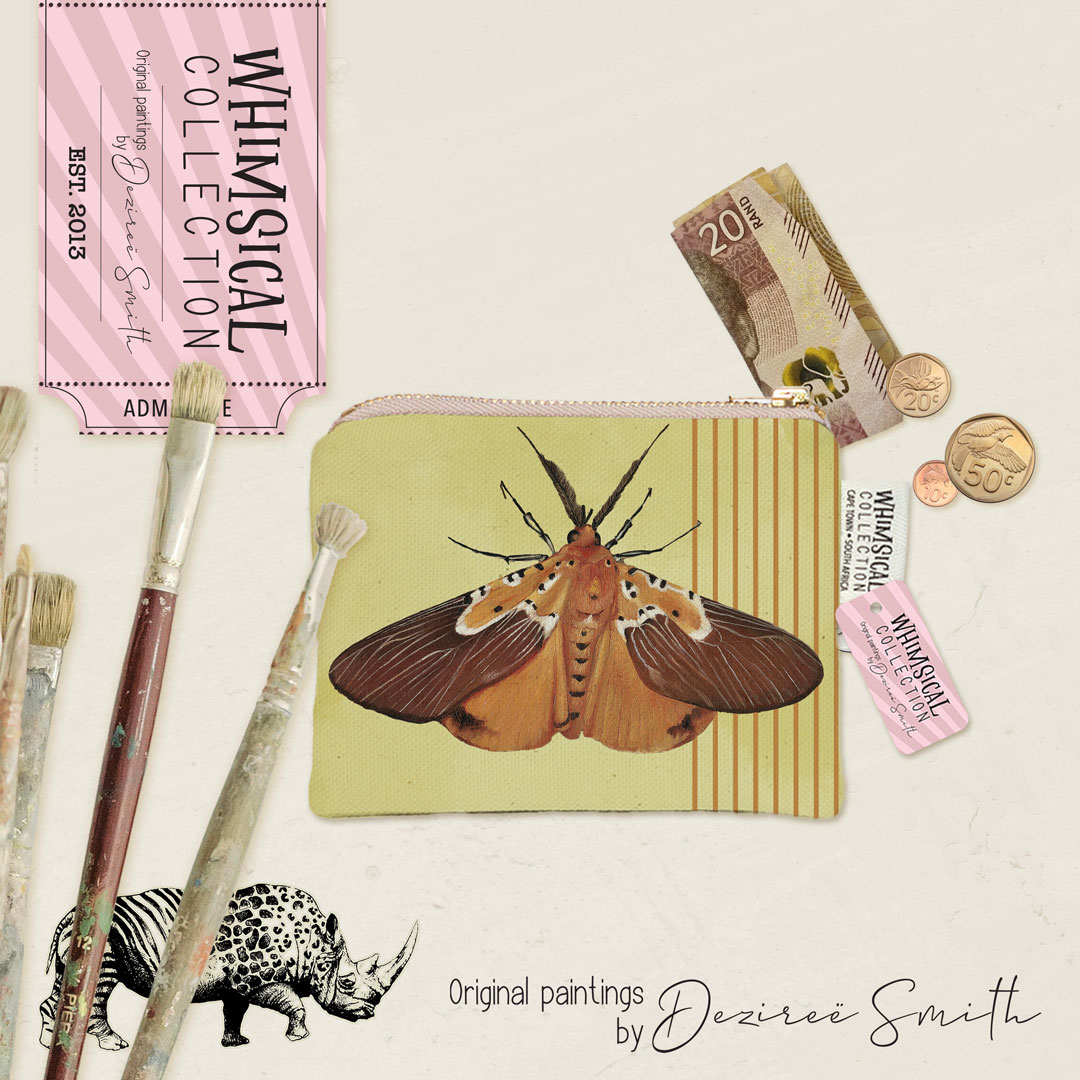 100% Cotton coin purse featuring a 'Specious Tiger Moth' from Whimsical Collection's 'Moths & Butterflies' collection in the 'African Insects' range. The original painting was done in oils by South African artist Dezireë Smith.