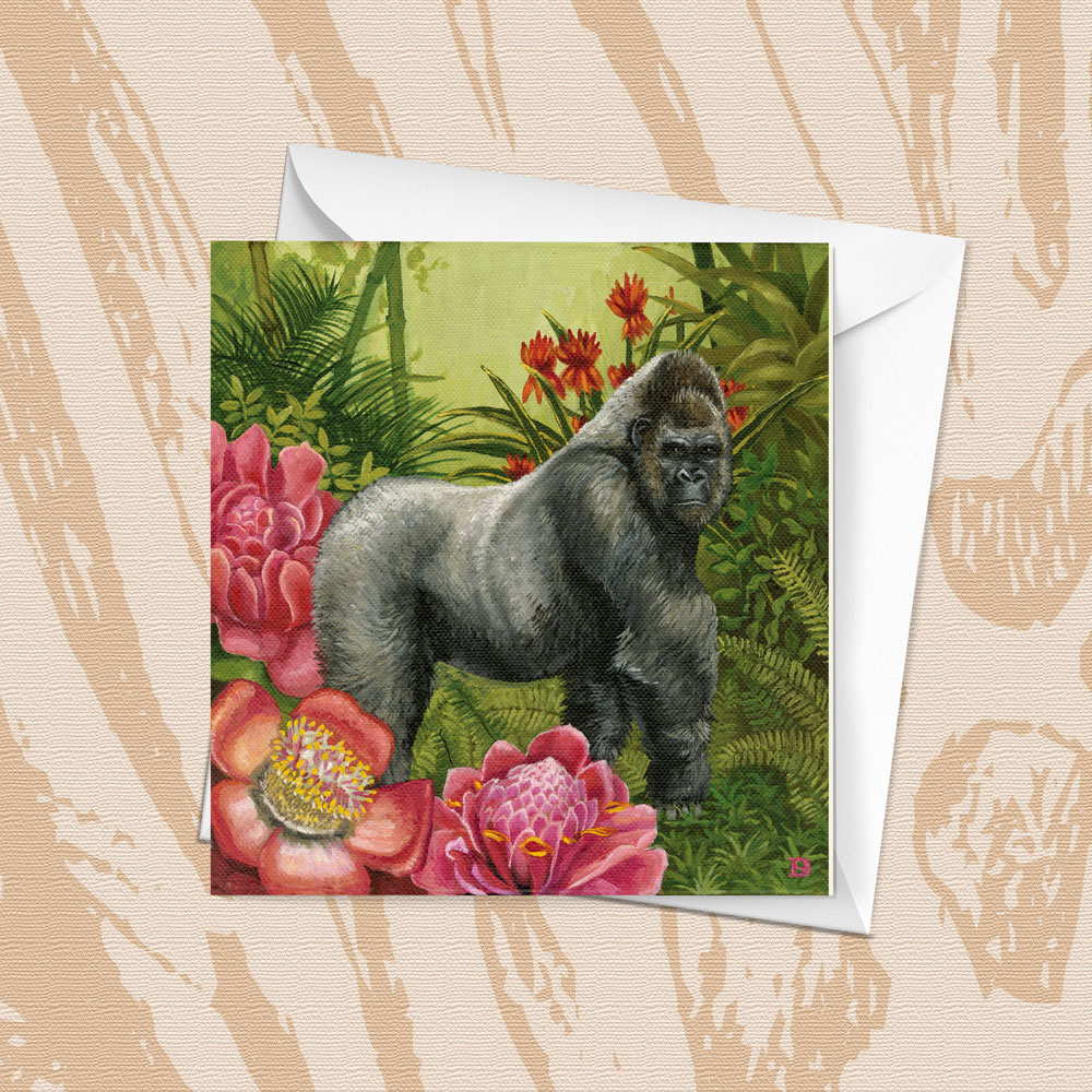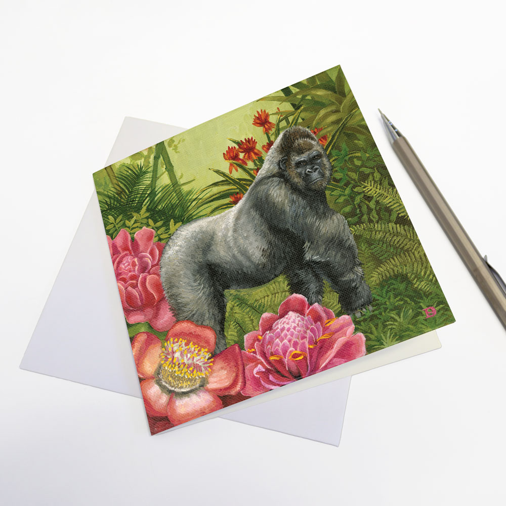 This blank greeting card features 'Spirit Gorilla' from the 'African Spirit' range by Whimsical Collection. The original painting was done in oils on canvas by South African artist Dezireë Smith.