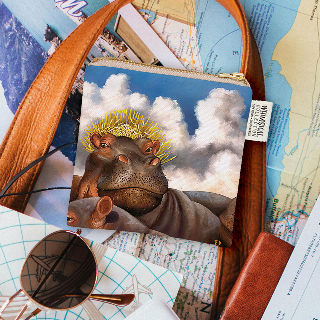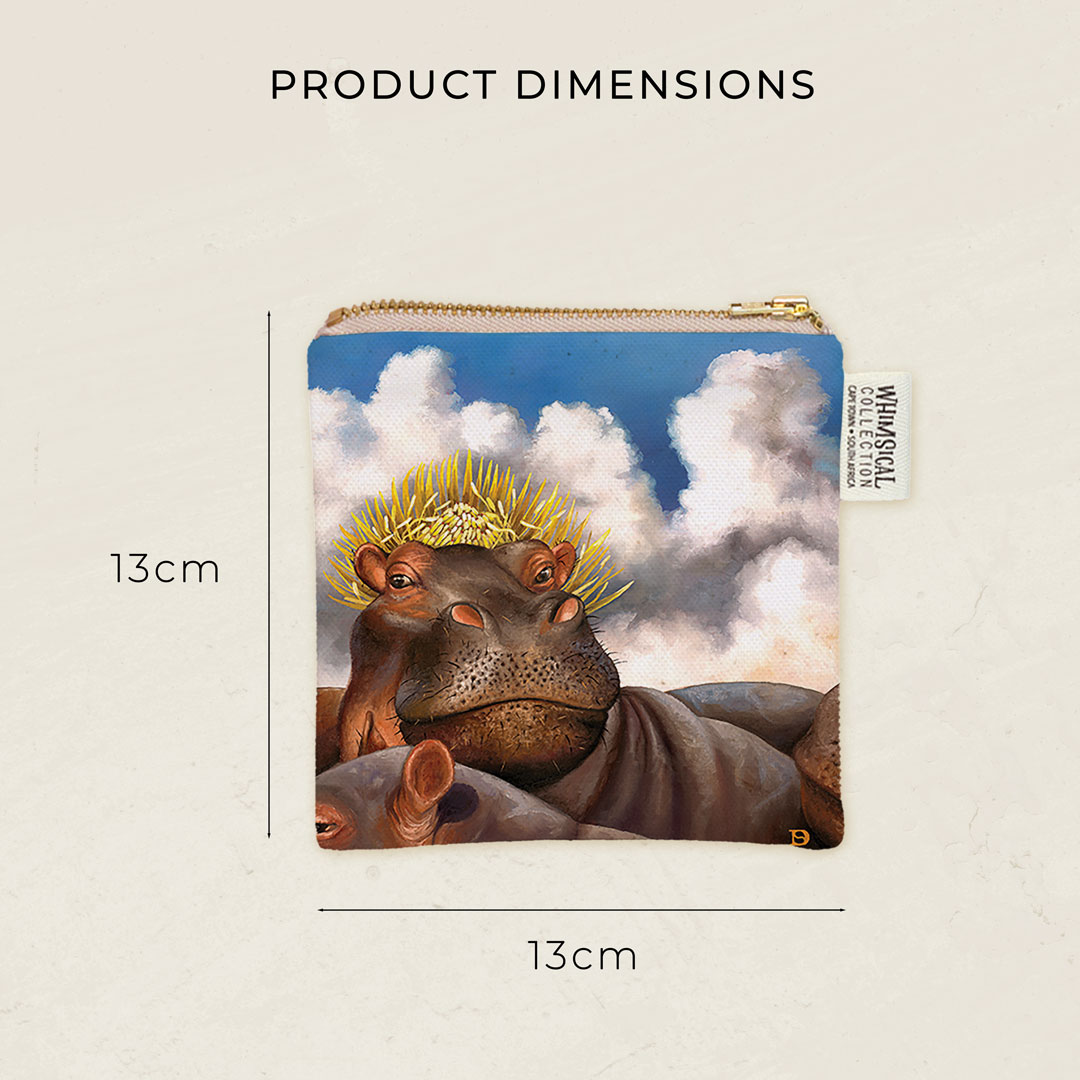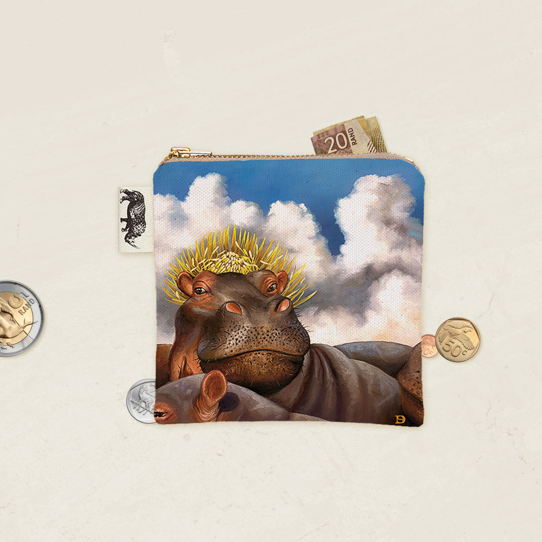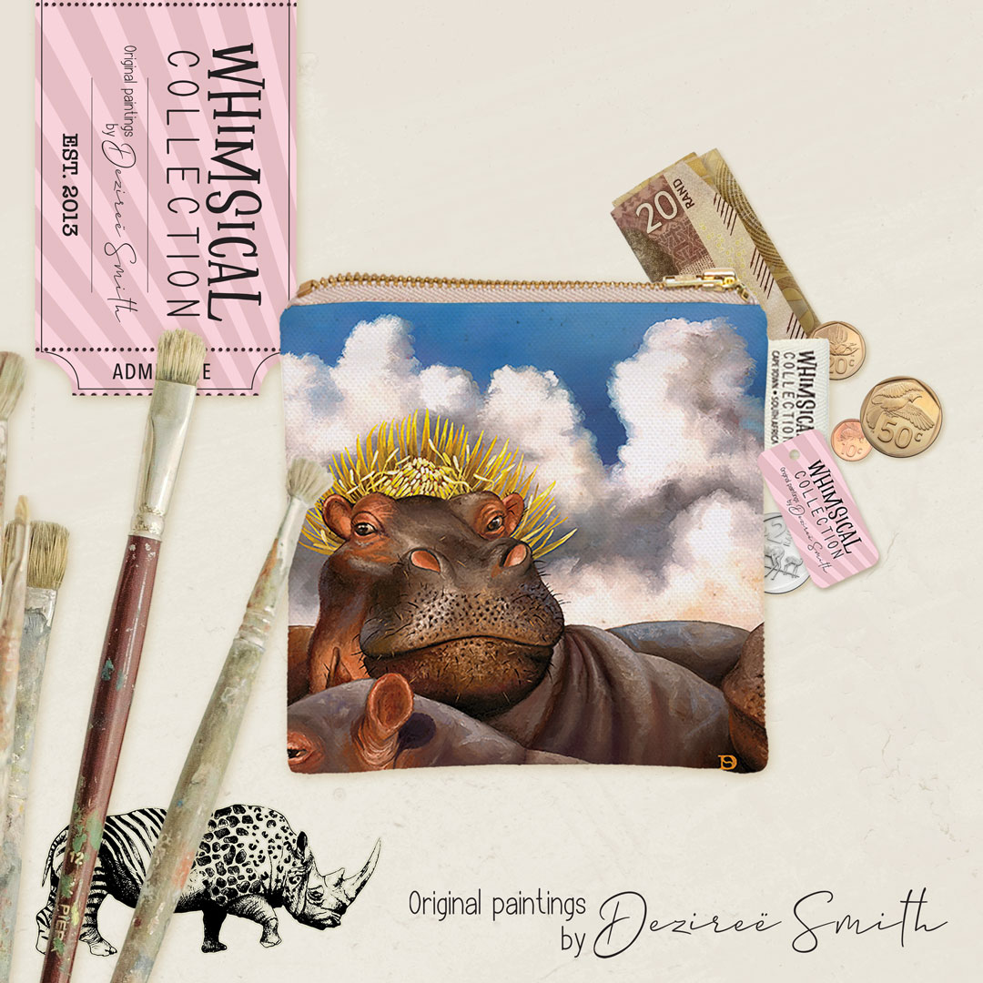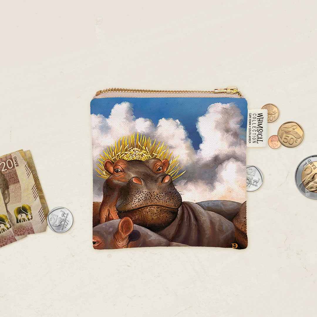 100% Cotton coin purse featuring 'Spirit Hippo' from Whimsical Collection's 'African Spirit' range. The original painting was done in oils on canvas by South African artist Dezireë Smith.