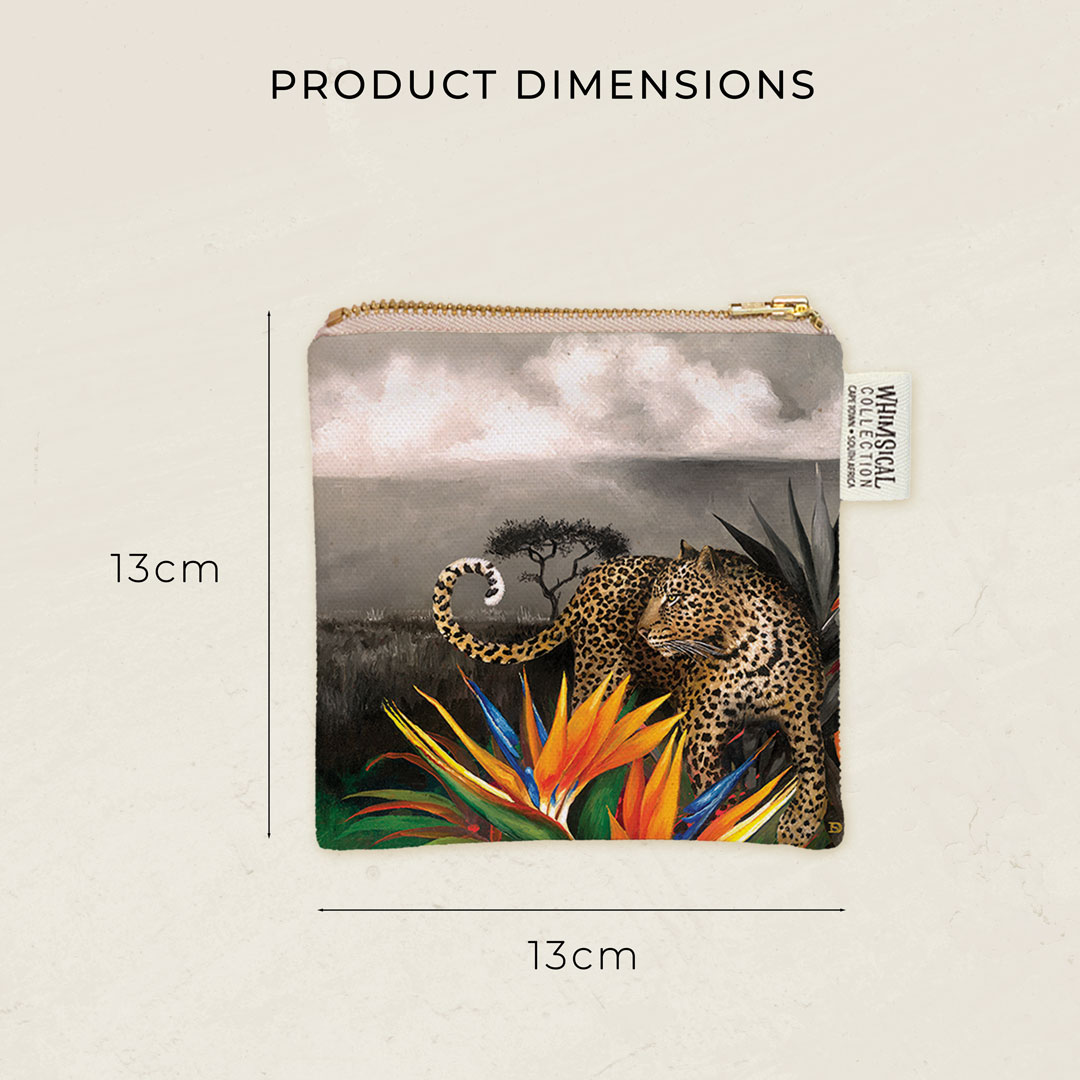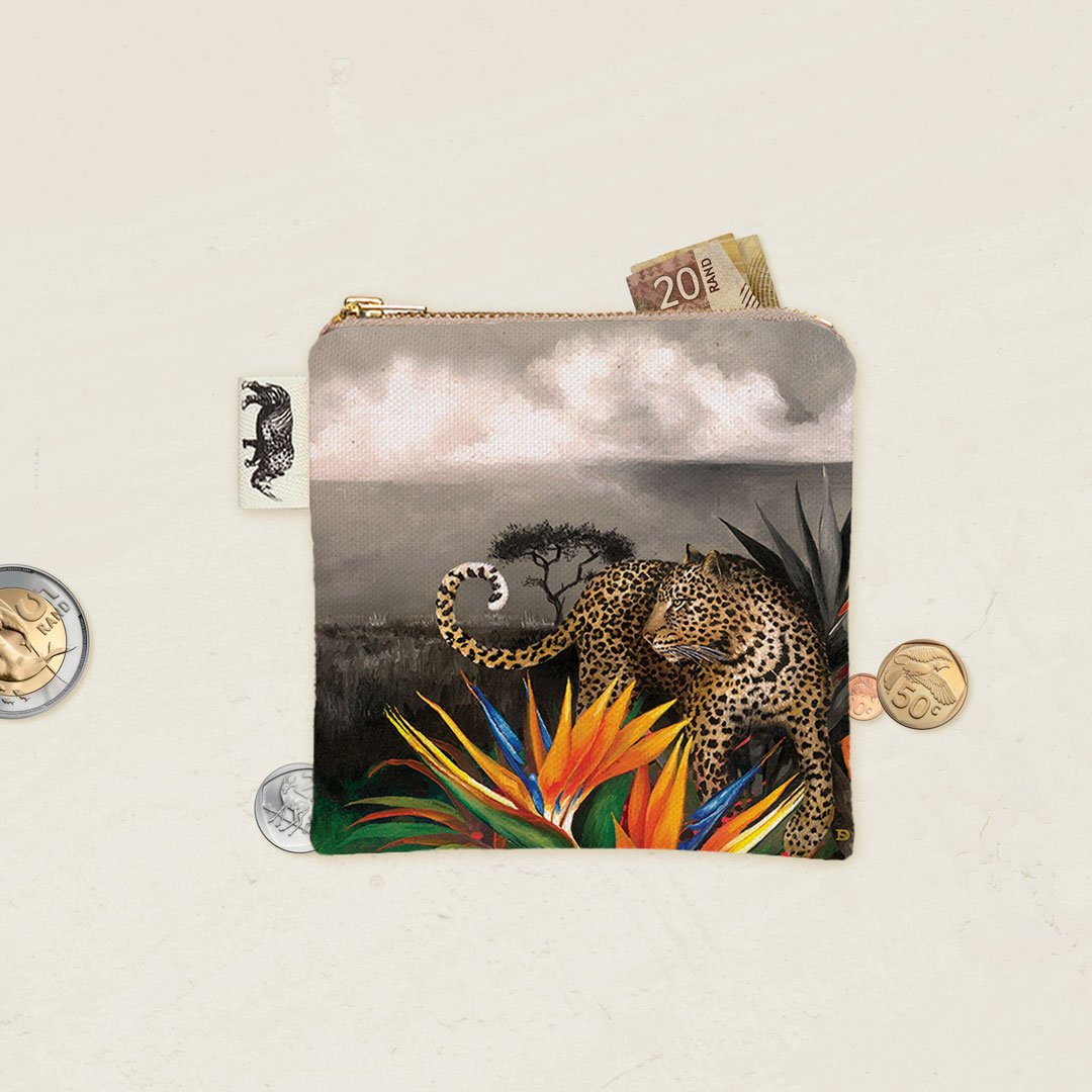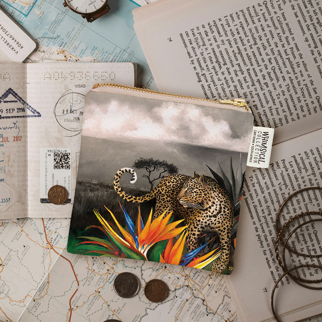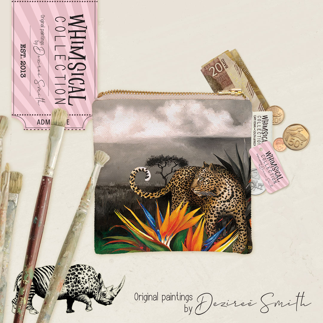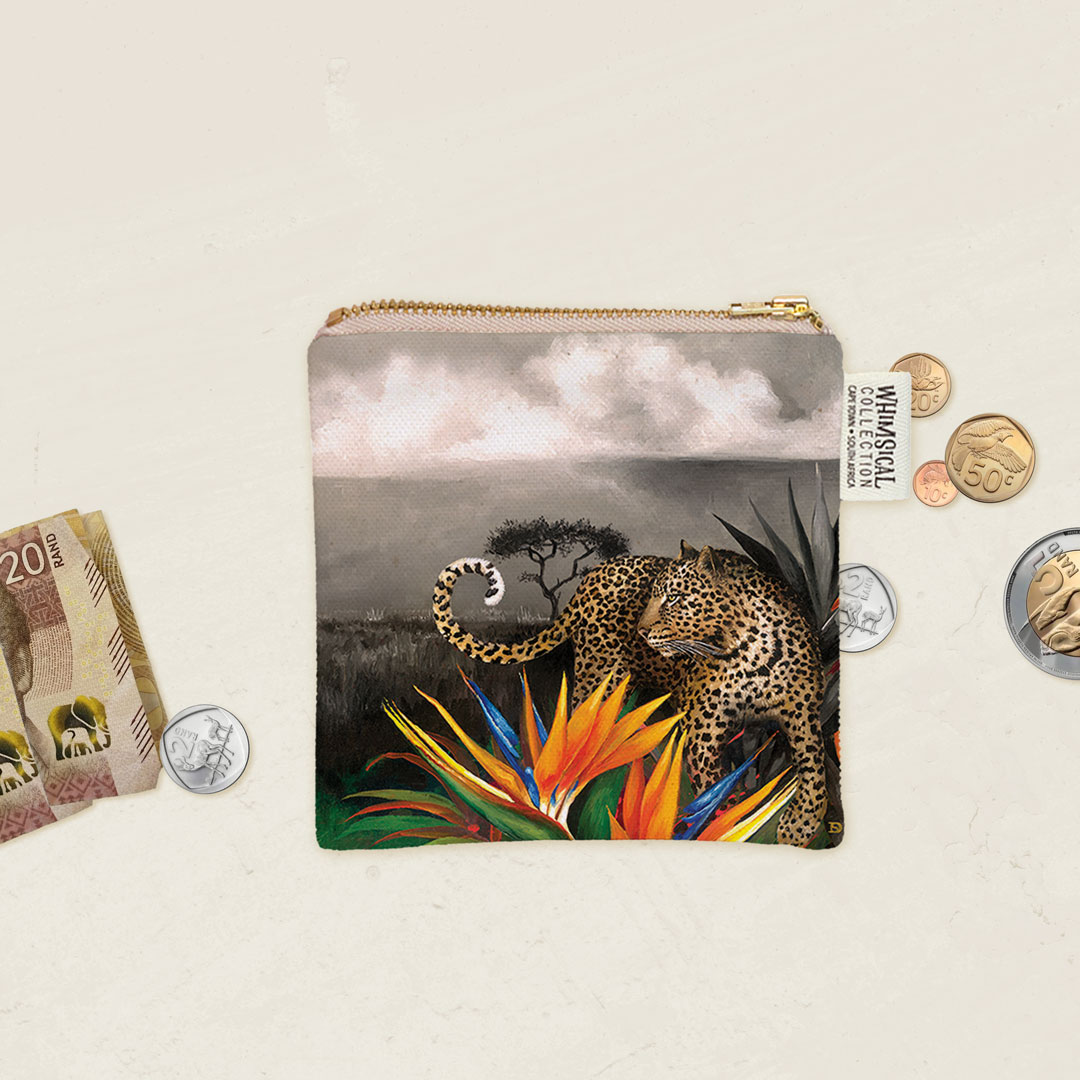 100% Cotton coin purse featuring 'Spirit Leopard' from Whimsical Collection's 'African Spirit' range. The original painting was done in oils on canvas by South African artist Dezireë Smith.