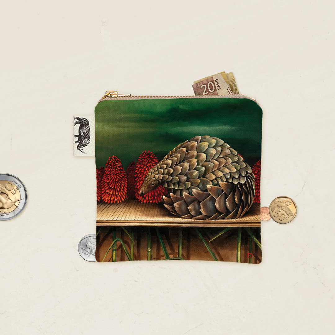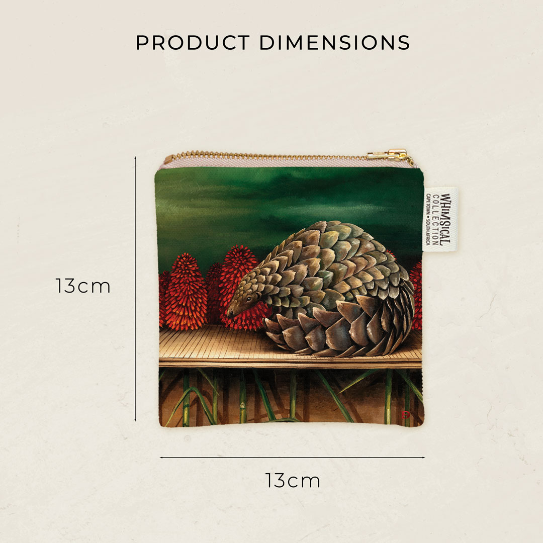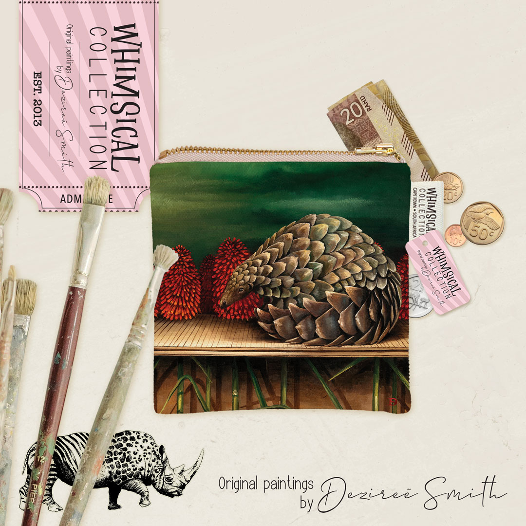 100% Cotton coin purse featuring 'Spirit Pangolin' from Whimsical Collection's 'African Spirit' range. The original painting was done in oils on canvas by South African artist Dezireë Smith.