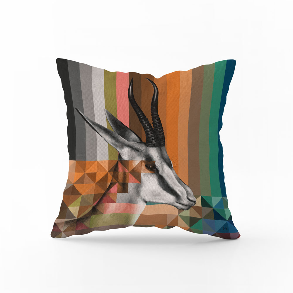 100% Cotton pillow cover featuring the springbok design from the 'Shades of Africa' range by Whimsical Collection. The Shades of Africa range is a colour adaptation of the original 'Wildlife in Colour' paintings done in oils on canvas by South African artist Dezireë Smith.