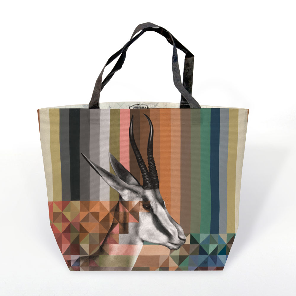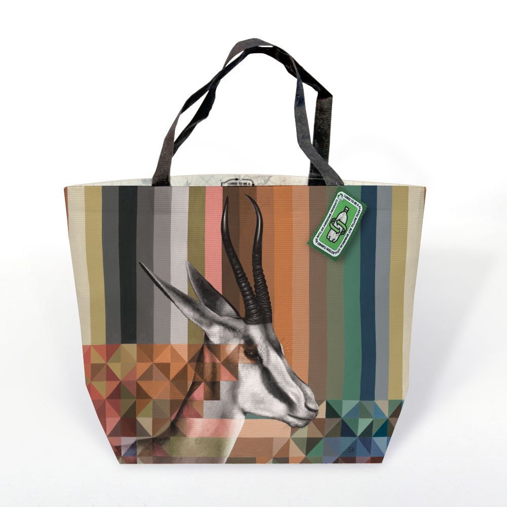 20L Shopping bag made from recycled fabric featuring 'Springbok in Shades of Africa' from Whimsical Collection's 'Shades of Africa' range. The Shades of Africa range is a colour adaptation of the original 'Wildlife in Colour' paintings done in oils on canvas by South African artist Dezireë Smith.