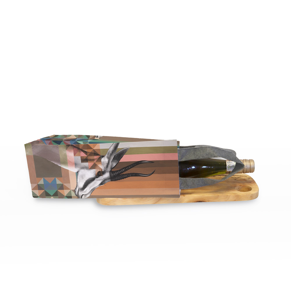 Wine carrier made from recycled fabric featuring 'Springbok in Shades of Africa' from Whimsical Collection's 'Shades of Africa' range. The Shades of Africa range is a colour adaptation of the original 'Wildlife in Colour' paintings done in oils on canvas by South African artist Dezireë Smith.