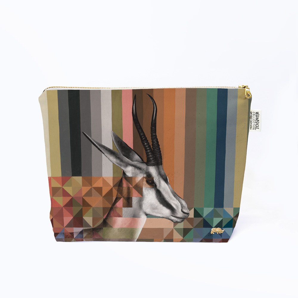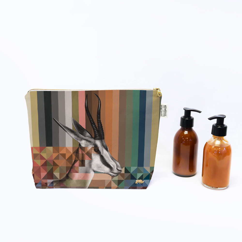 100% Cotton toiletry bag featuring 'Springbok in Shades of Africa' from Whimsical Collection's 'Wildlife in Shades of Africa' range. The Shades of Africa range is a colour adaptation of the original 'Wildlife in Colour' paintings done in oils on canvas by South African artist Dezireë Smith.