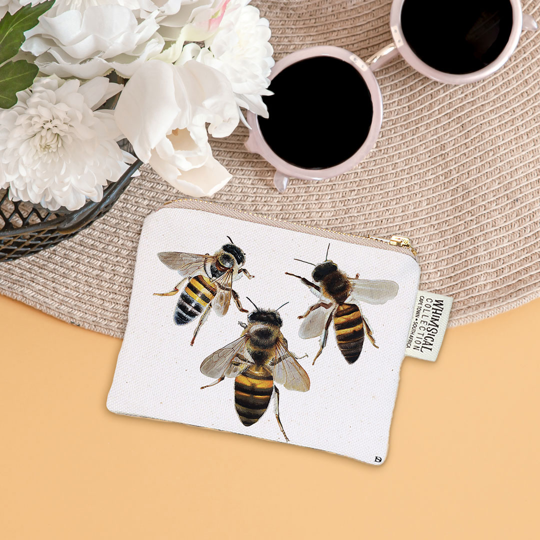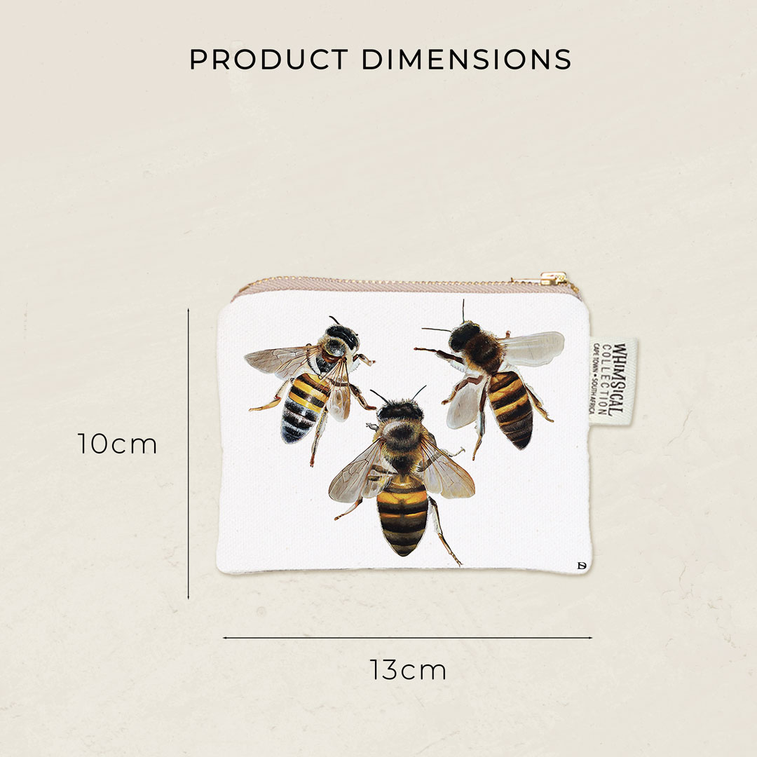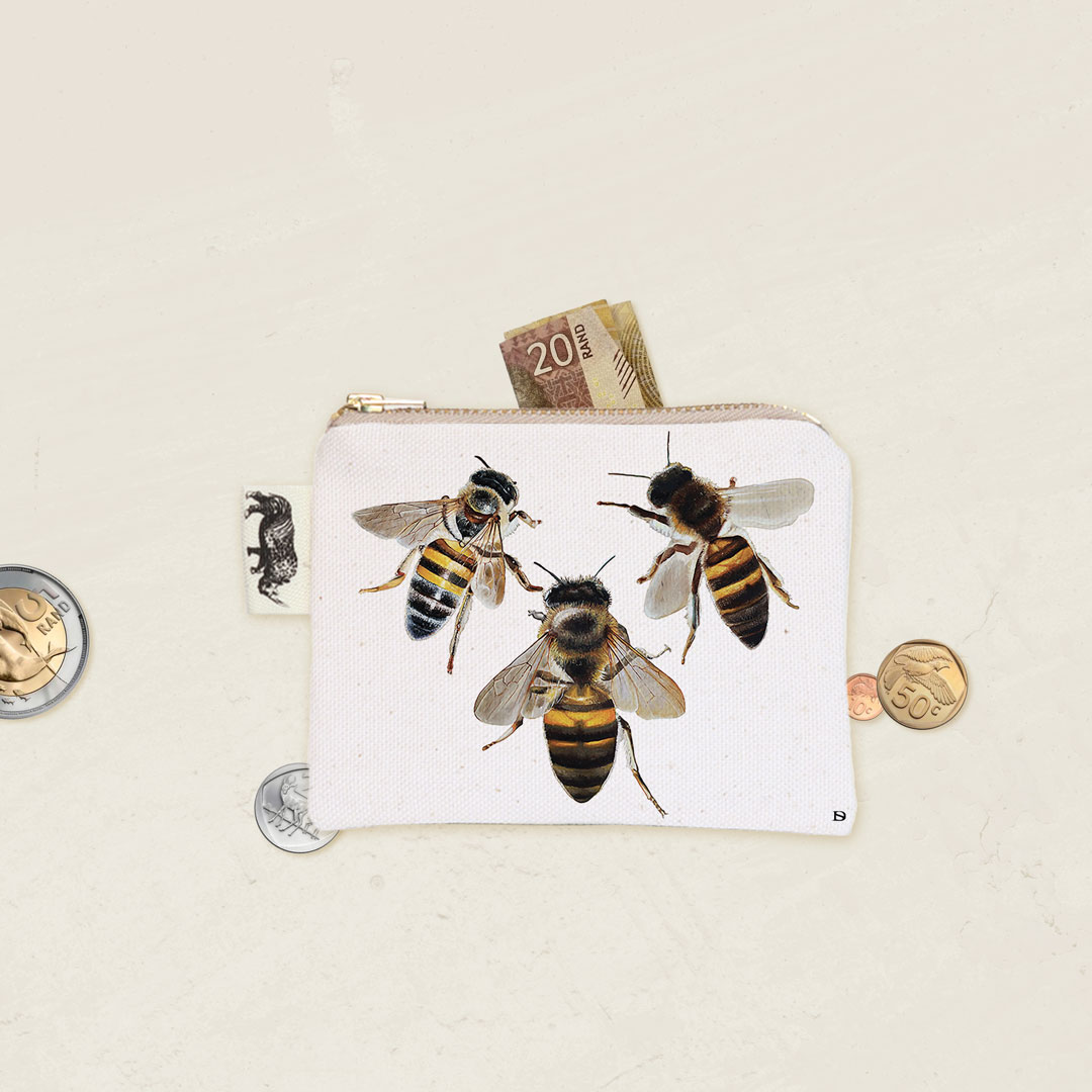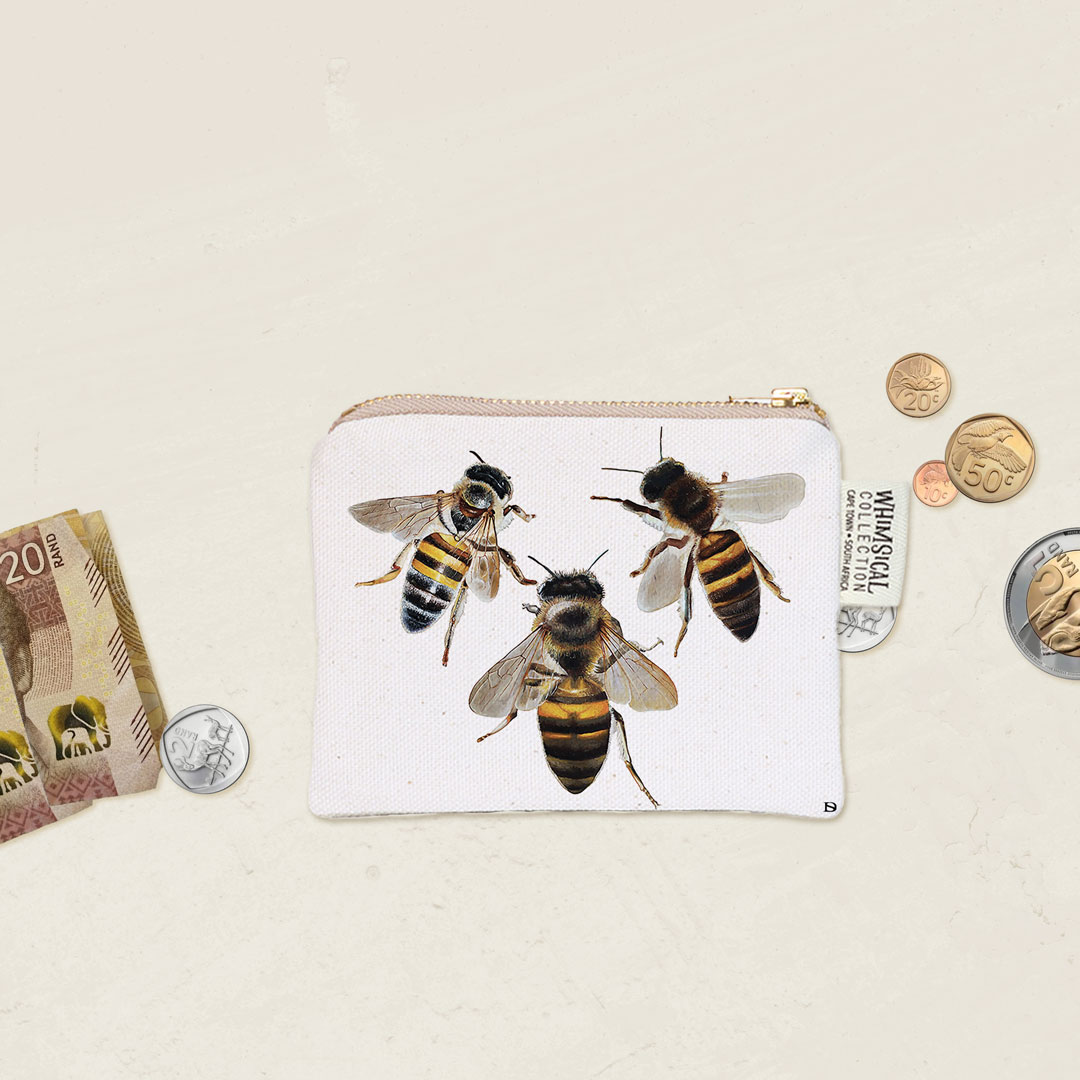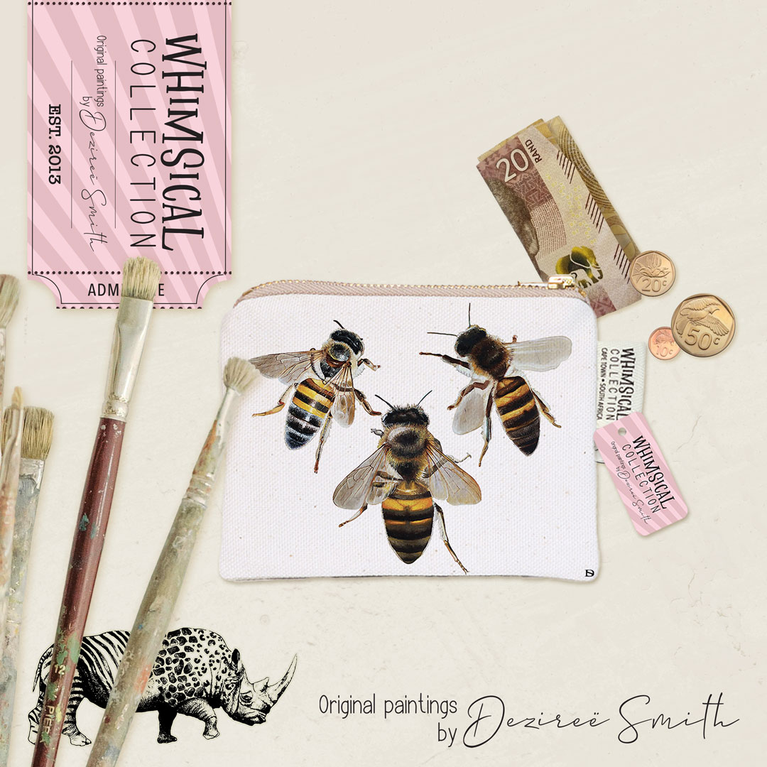 100% Cotton coin purse featuring 'White Bees' from Whimsical Collection's 'African Insects' range. The original painting was done in oils on canvas by South African artist Dezireë Smith.