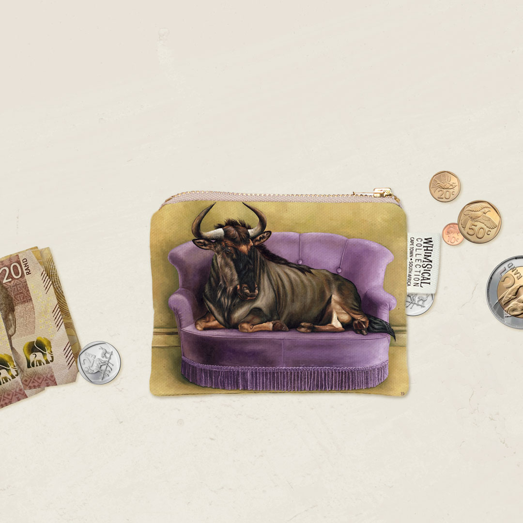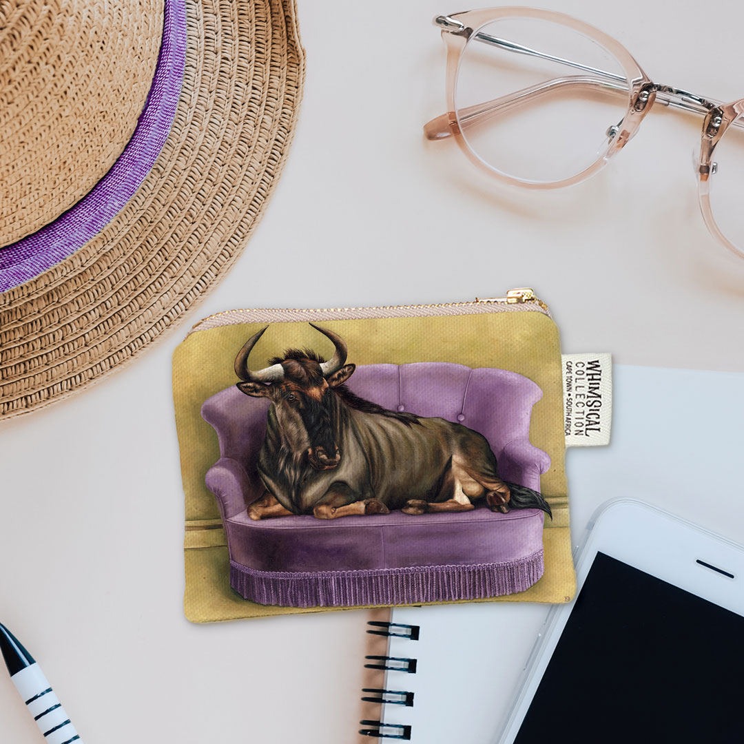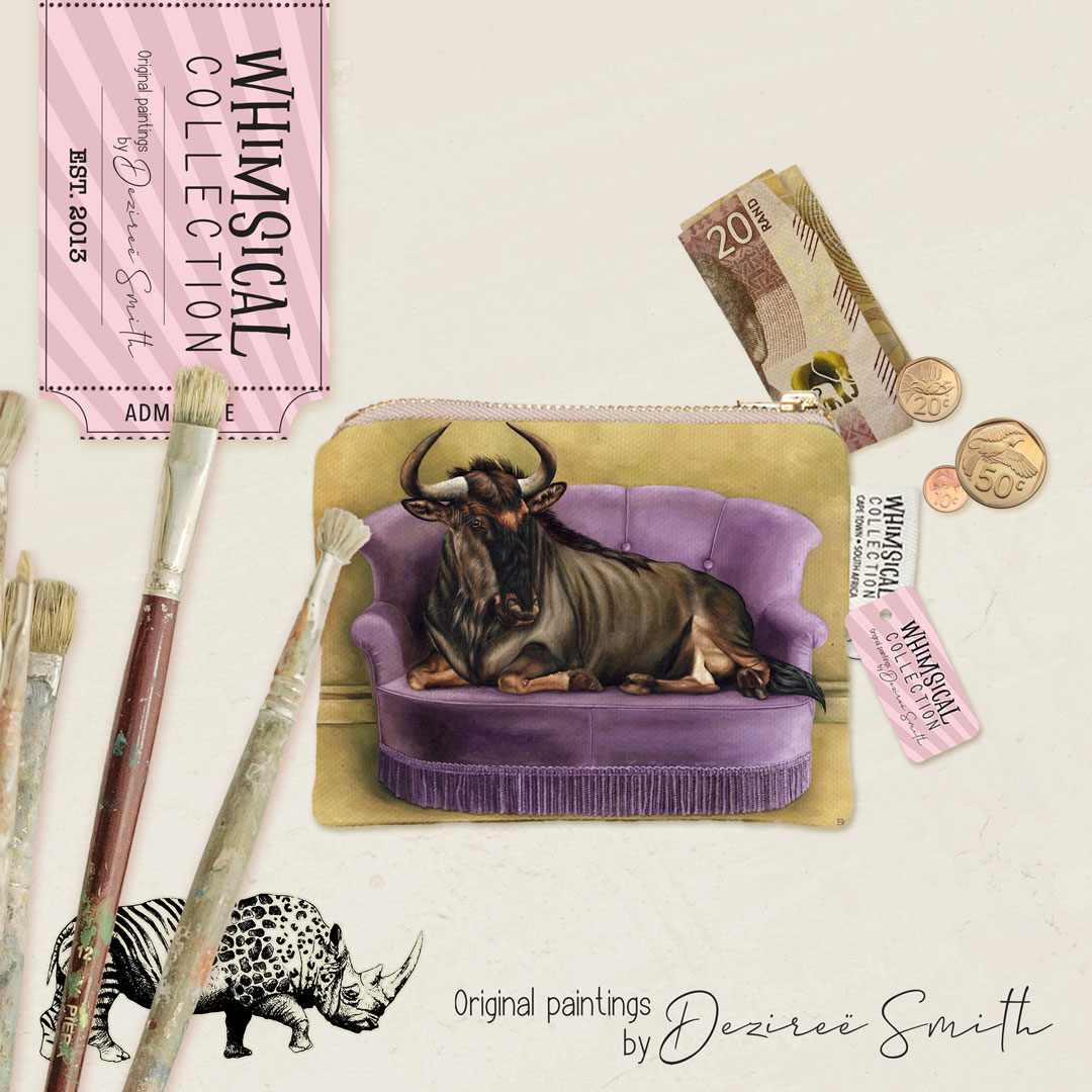 100% Cotton coin purse featuring 'Wildebeest at Leisure' from Whimsical Collection's 'Wildlife at Leisure' range. The original painting was done in oils on canvas by South African artist Dezireë Smith.