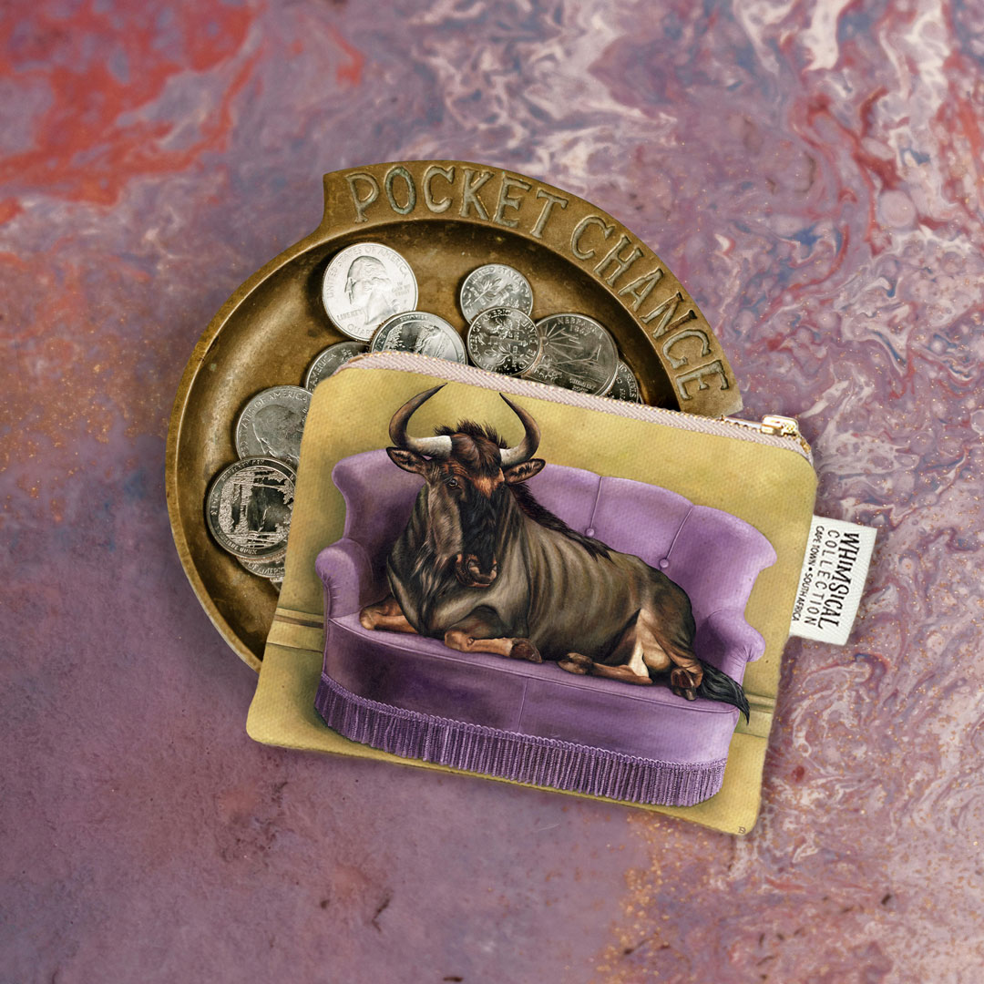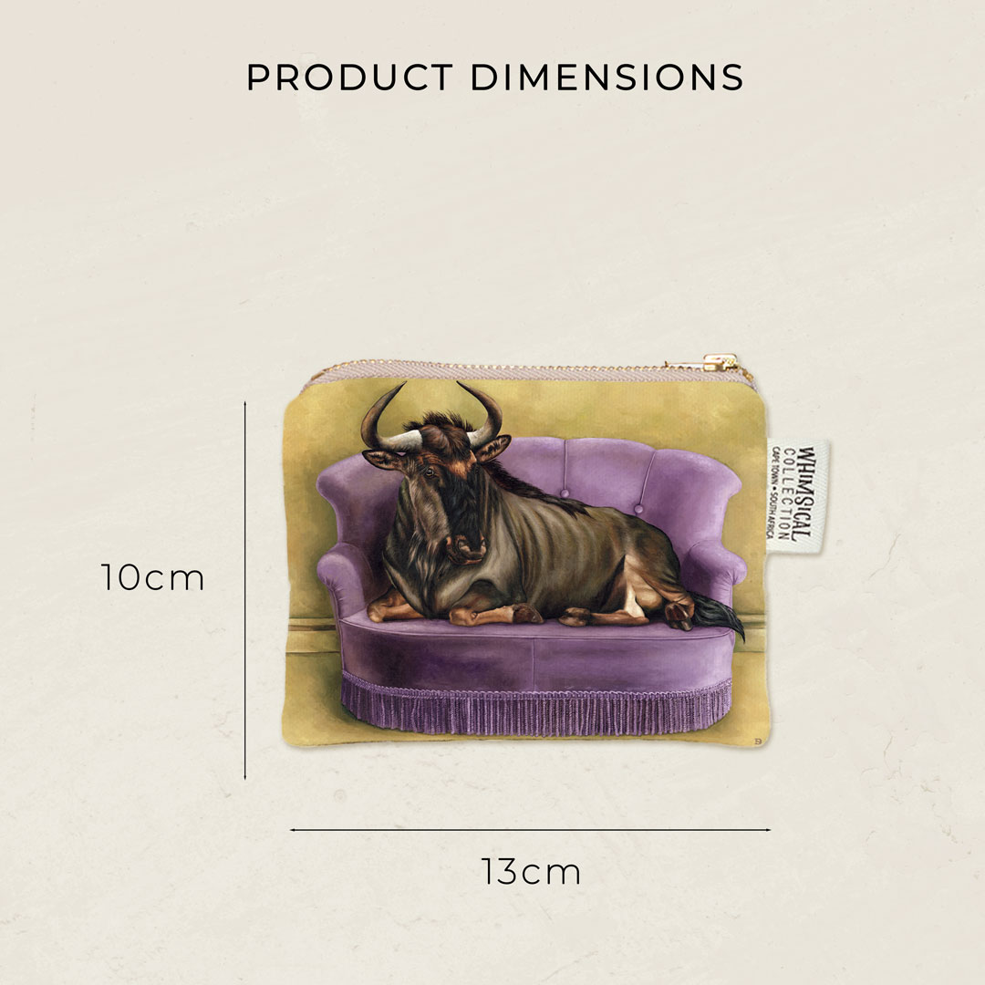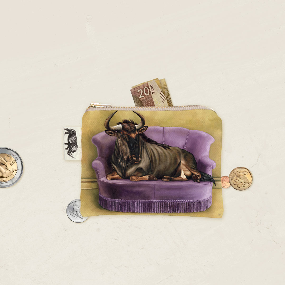 100% Cotton coin purse featuring 'Wildebeest at Leisure' from Whimsical Collection's 'Wildlife at Leisure' range. The original painting was done in oils on canvas by South African artist Dezireë Smith.