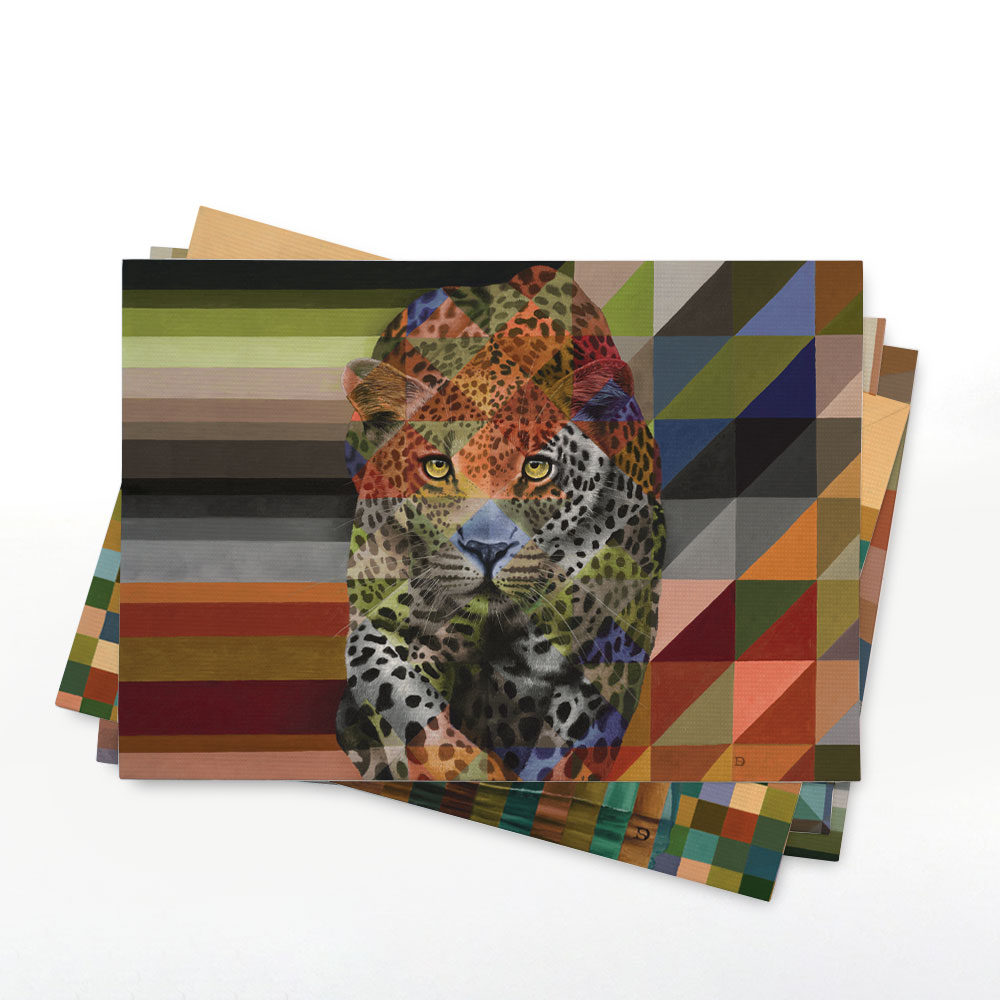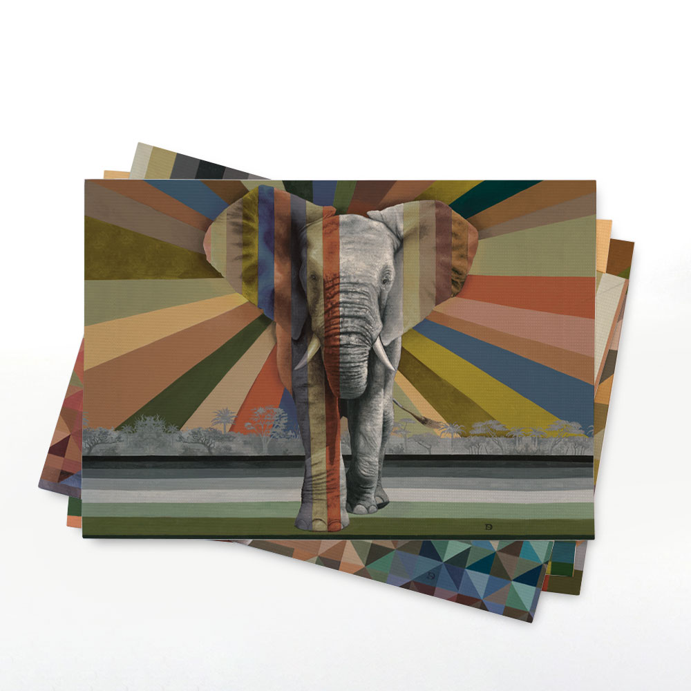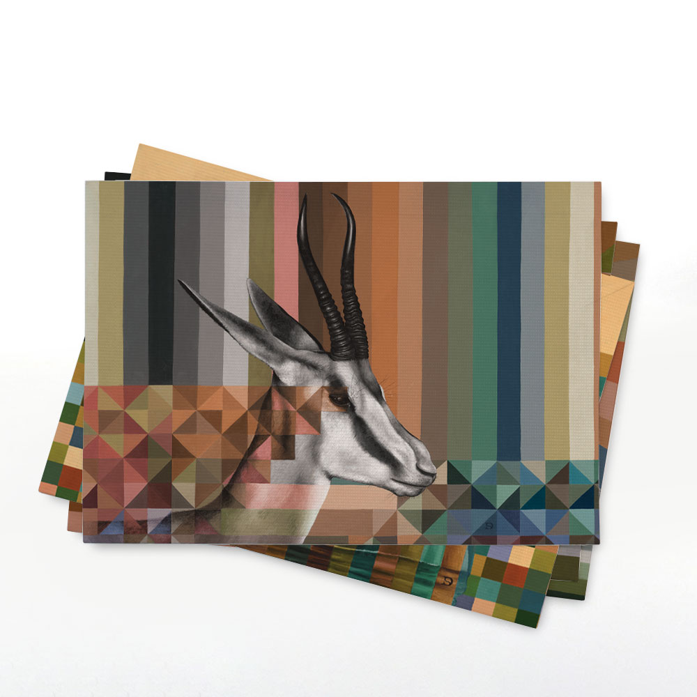 Variety set of four placemats made from recycled fabric featuring the elephant, leopard, springbok & leopard from Whimsical Collection's 'Shades of Africa' range. The Shades of Africa range is a colour adaptation of the original 'Wildlife in Colour' paintings done in oils on canvas by South African artist Dezireë Smith.