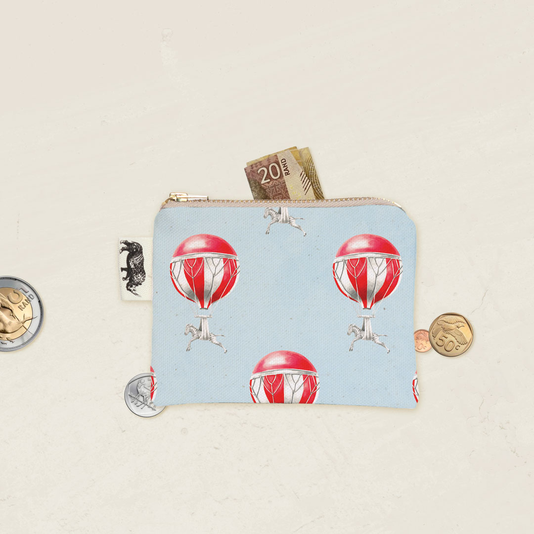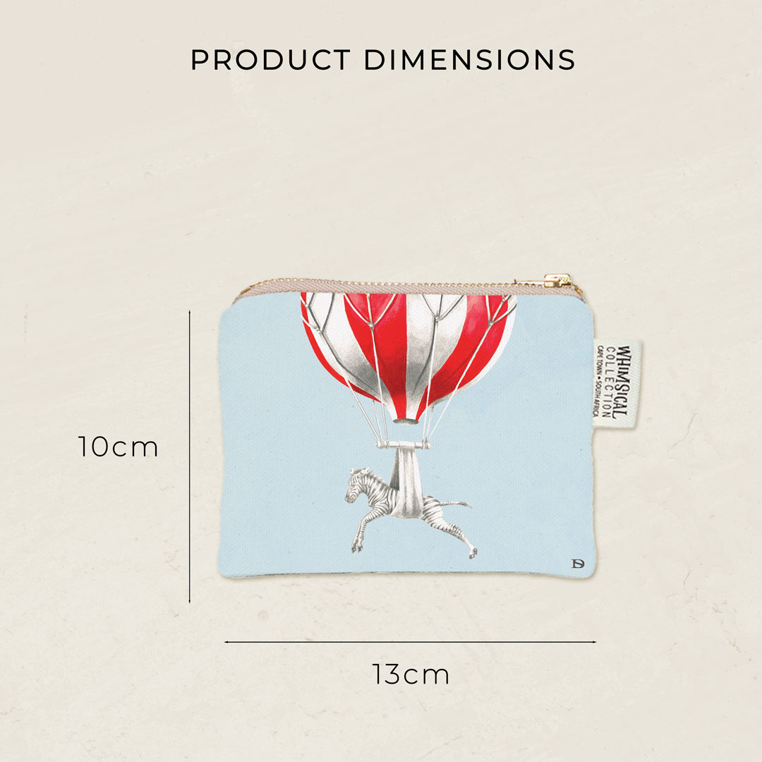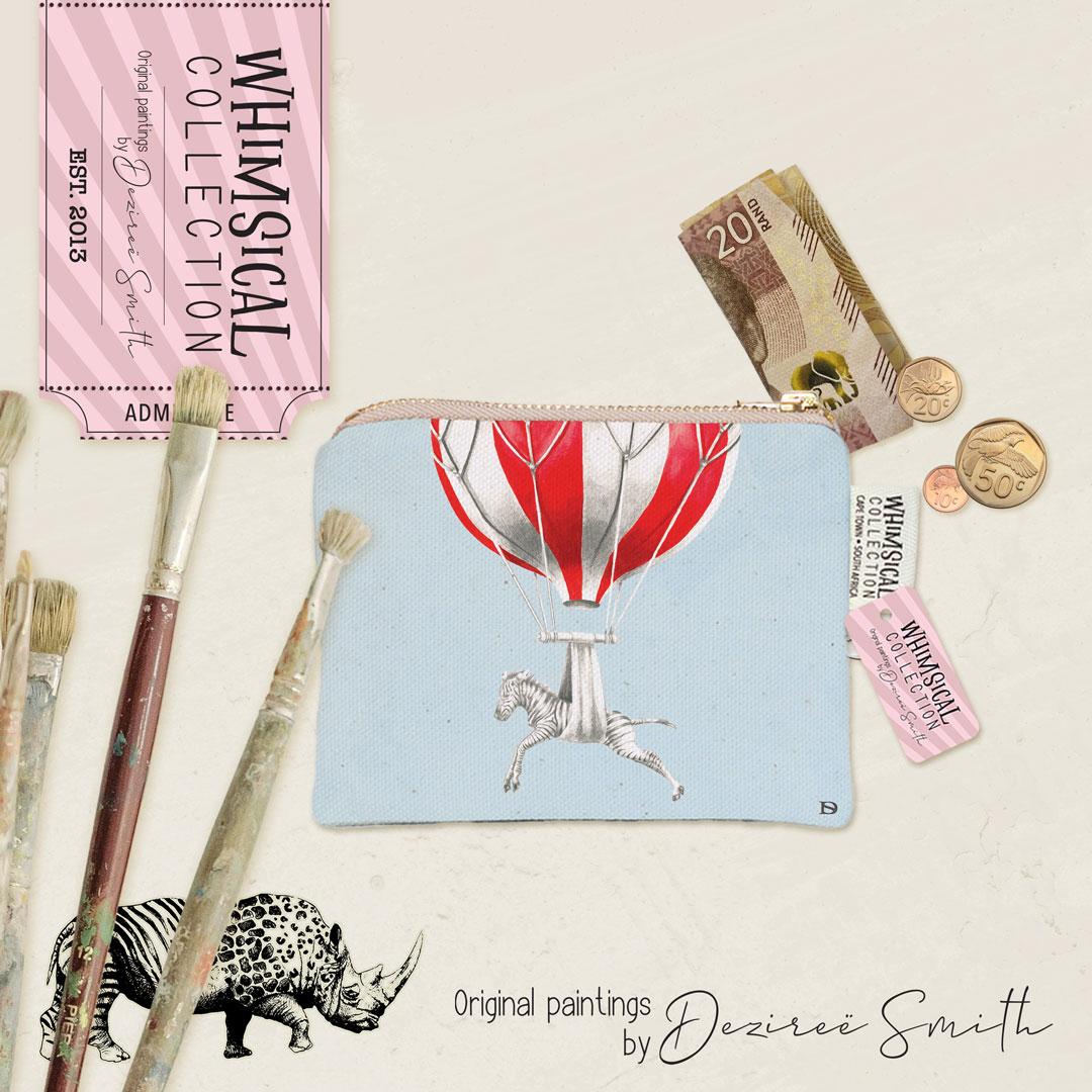 100% Cotton coin purse featuring 'Zebra in Flight' from Whimsical Collection's 'Wildlife in Flight' range. The original artwork was done in paint and pencil on paper by South African artist Dezireë Smith.