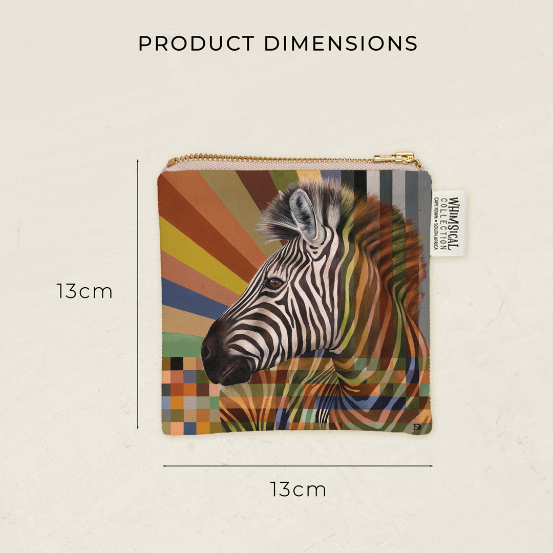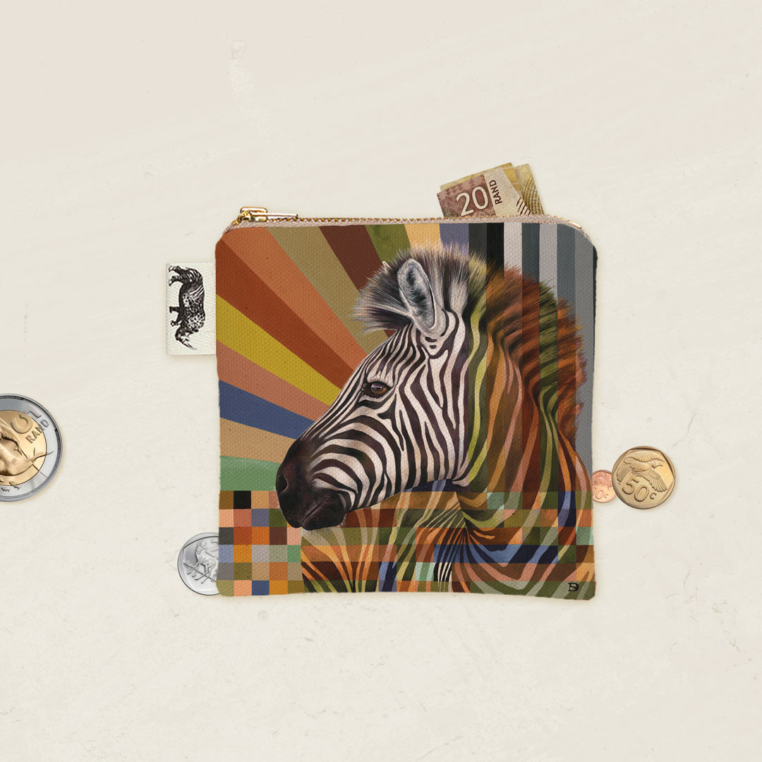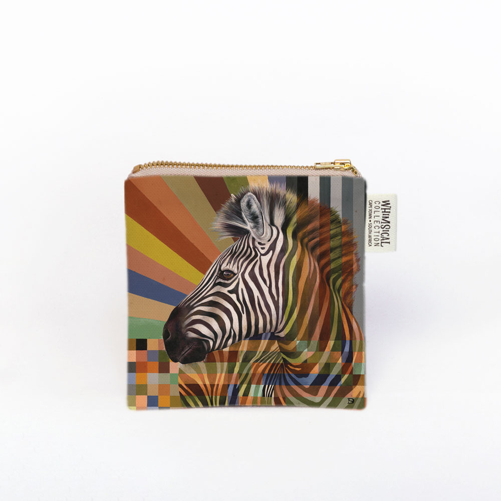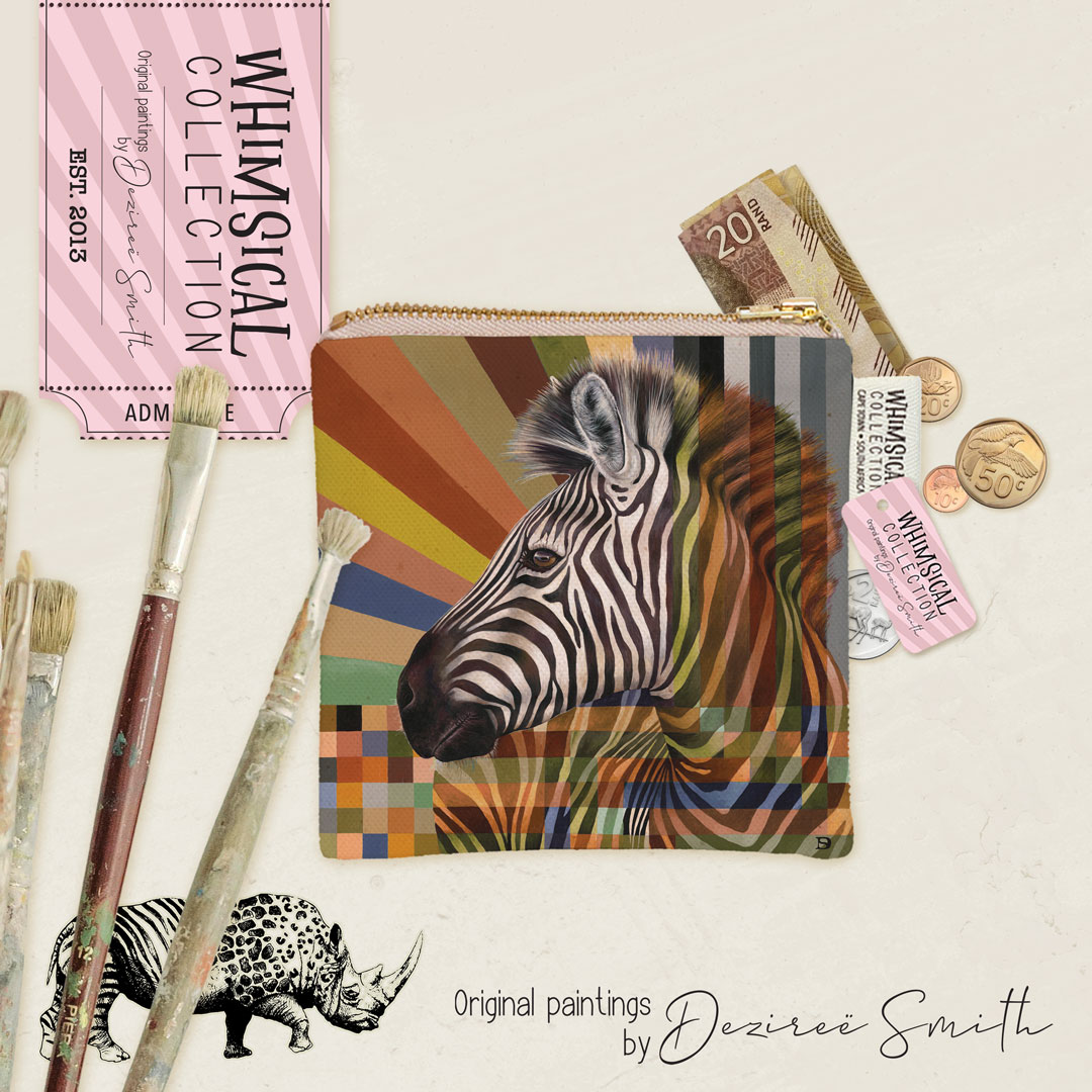 100% Cotton coin purse featuring 'Zebra in Shades of Africa' from Whimsical Collection's 'Shades of Africa' range. The Shades of Africa range is a colour adaptation of the original 'Wildlife in Colour' paintings done in oils on canvas by South African artist Dezireë Smith.