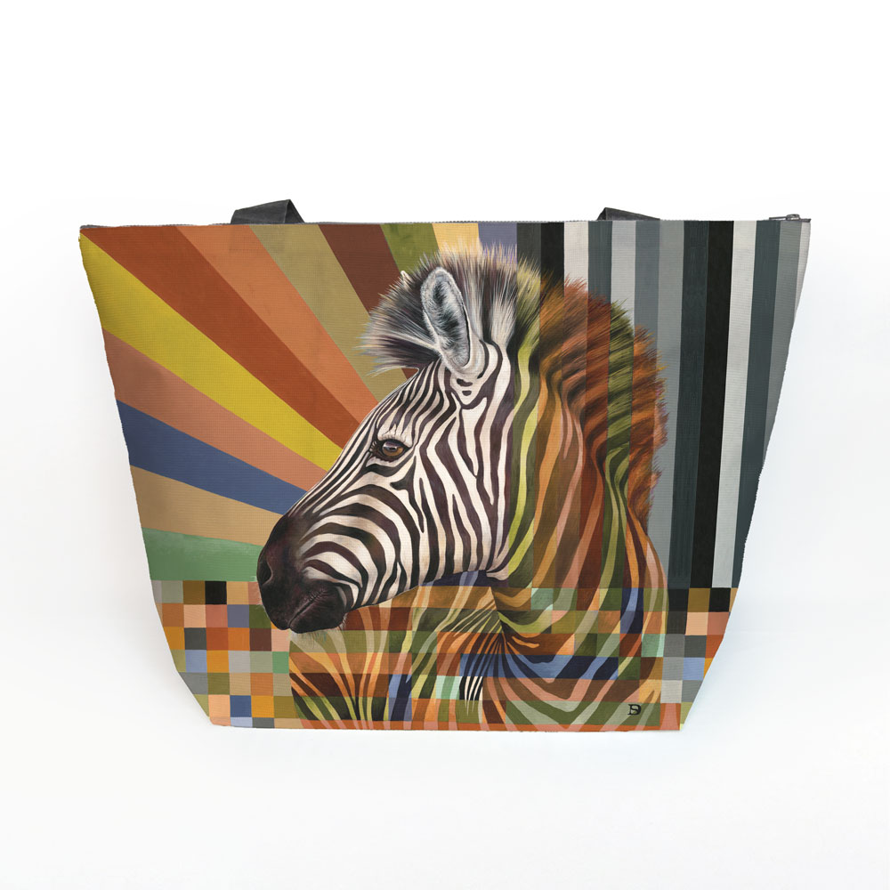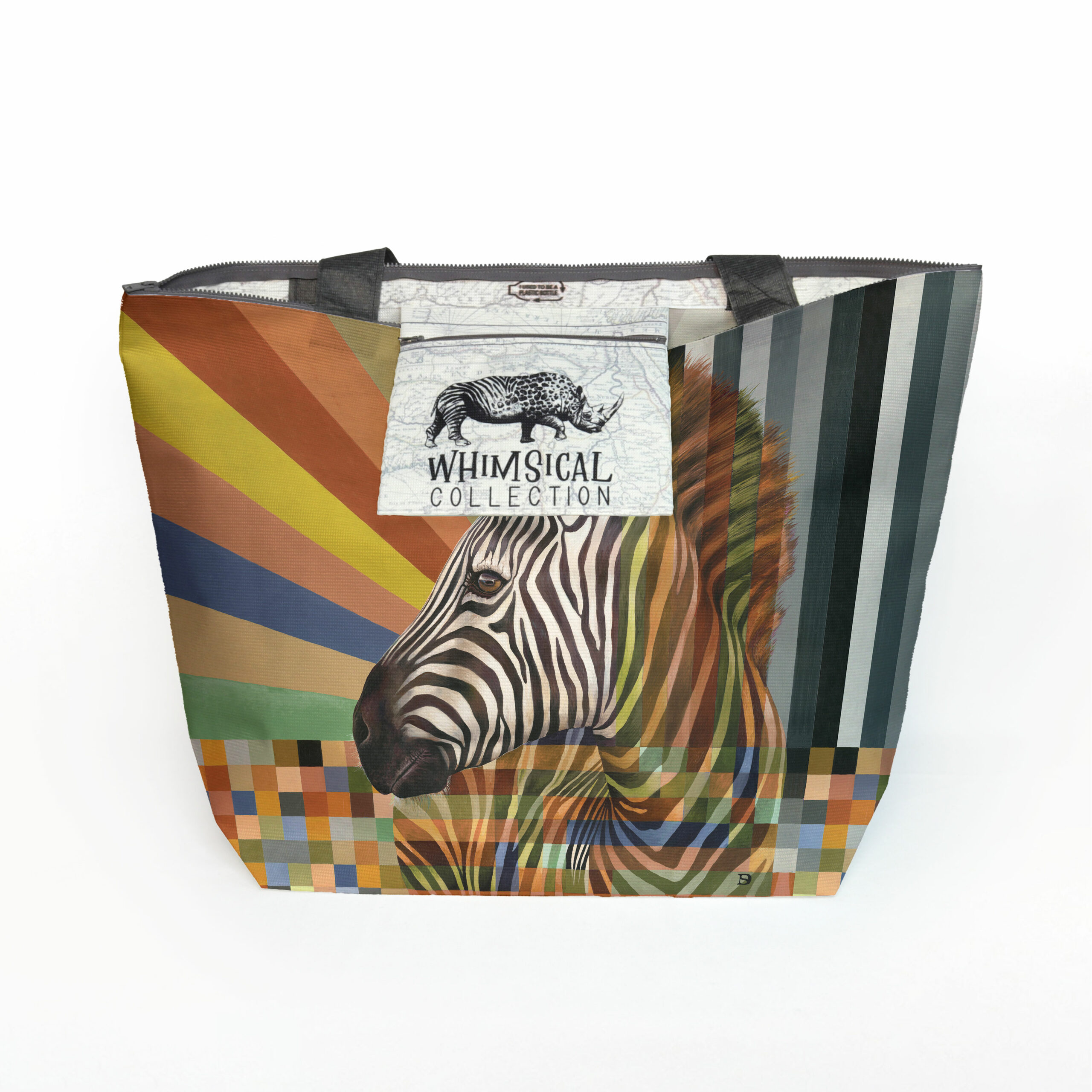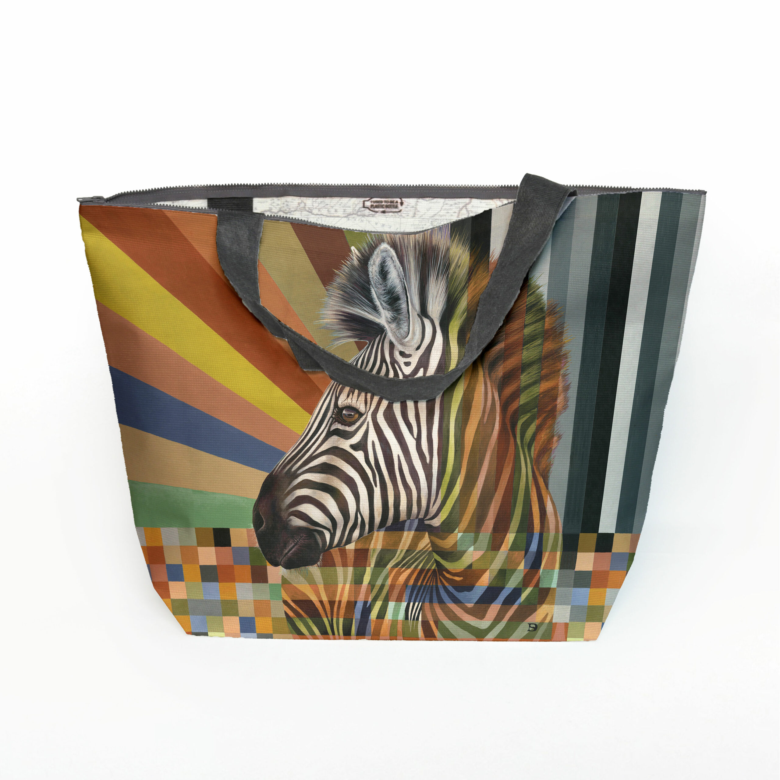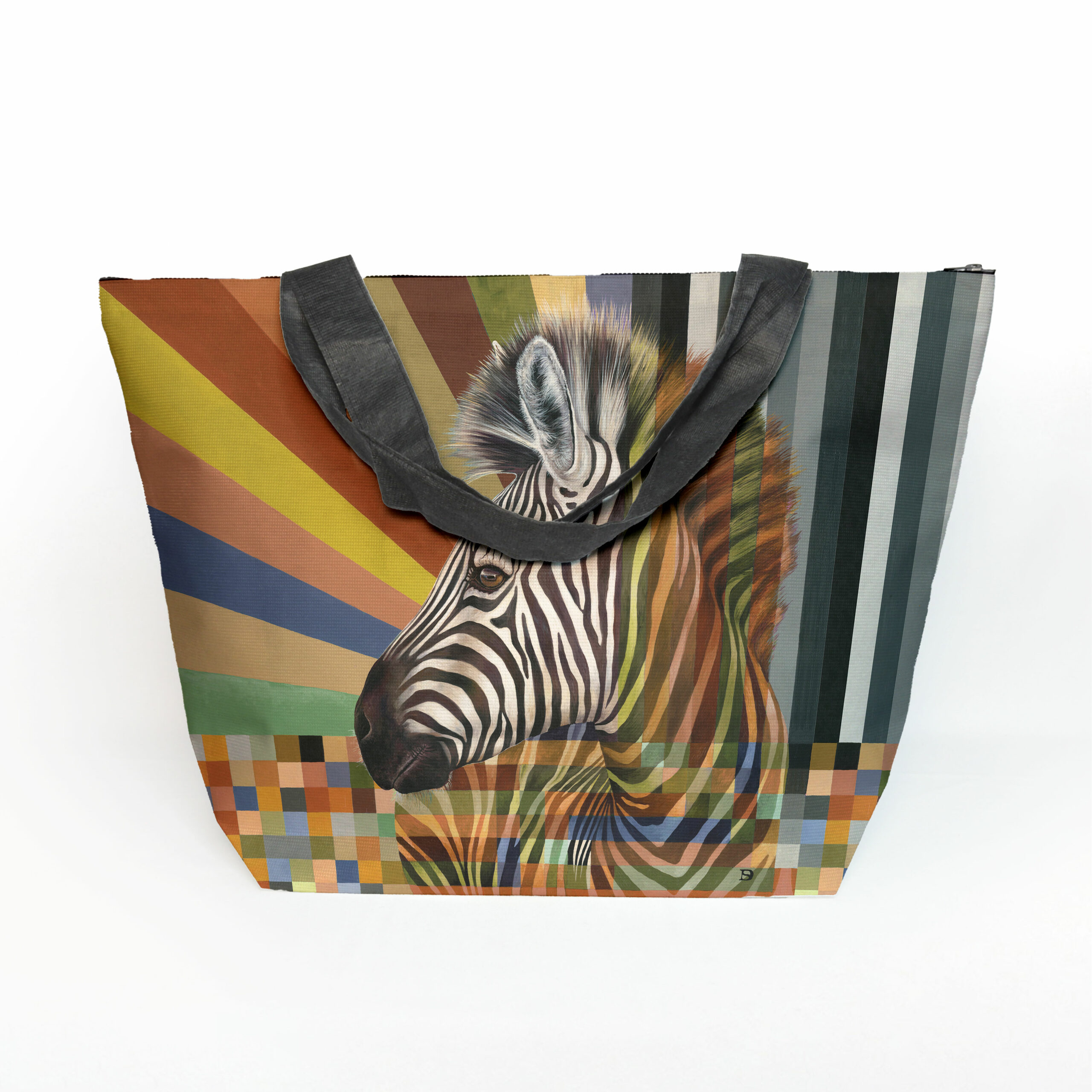 Maxi beach bag made from recycled fabric featuring 'Zebra in Shades of Africa' from Whimsical Collection's 'Wildlife in Colour' range. The Shades of Africa range is a colour adaptation of the original 'Wildlife in Colour' paintings done in oils on canvas by South African artist Dezireë Smith.