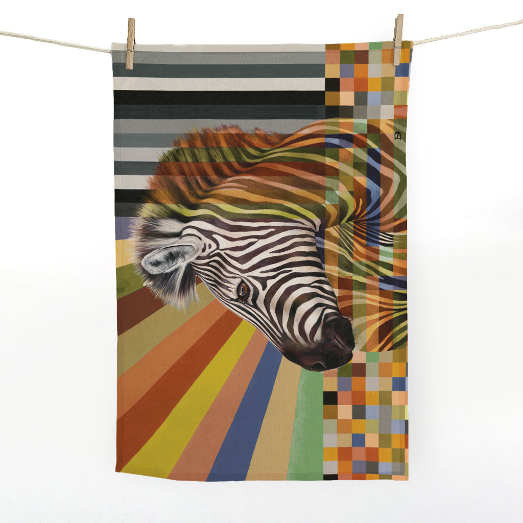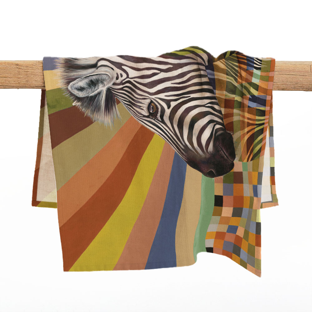100% Cotton tea towel featuring 'Zebra in Shades of Africa' from the 'Shades of Africa' range by Whimsical Collection. The Shades of Africa range is a colour adaptation of the original 'Wildlife in Colour' paintings done in oils on canvas by South African artist Dezireë Smith.